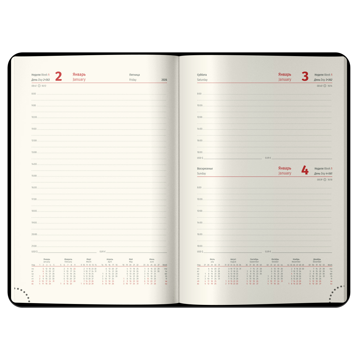 Модель формата А6 (115*160 мм) имеет внутренний блок из 184 листов высококачественной кремовой бумаги повышенной плотности 80 г/м2 с пантонной печатью блока в 2 краски, справочный материал. Перфорированные уголки и 2 закладки-ляссе сделают использование ежедневника комфортным. 3 комплекта стикеров станут приятным подарком.