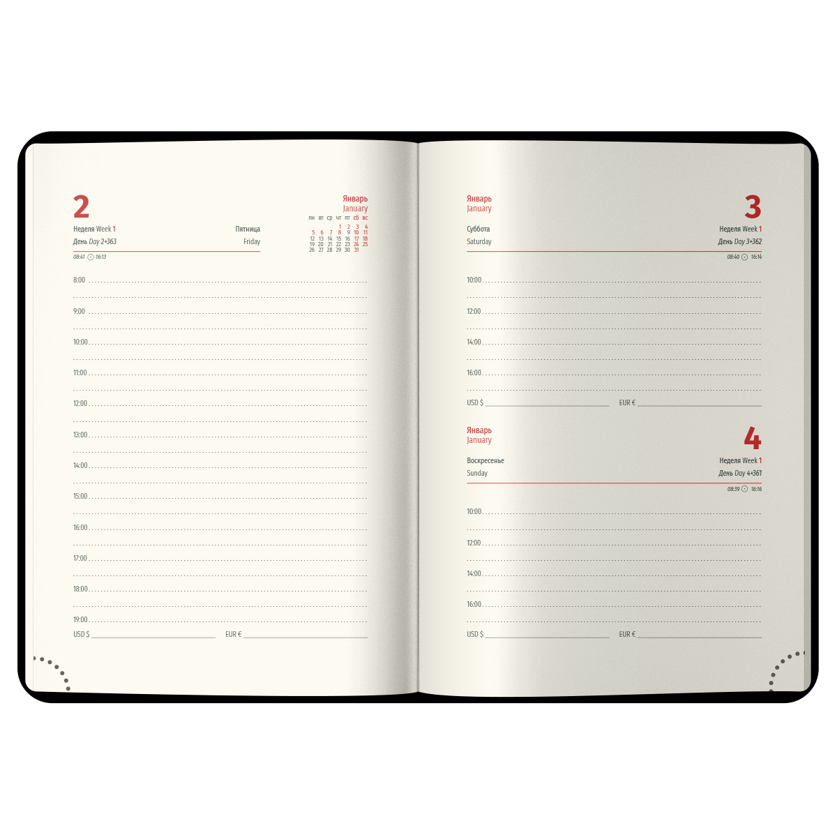 Перфорированные уголки страниц и две закладки-ляссе делают использование более комфортным. Приятное дополнение — три комплекта стикеров. Внутри размещены отрывные заметки, бланки извещения о ДТП и справочные материалы. Датированный ежедневник подходит под персонализацию