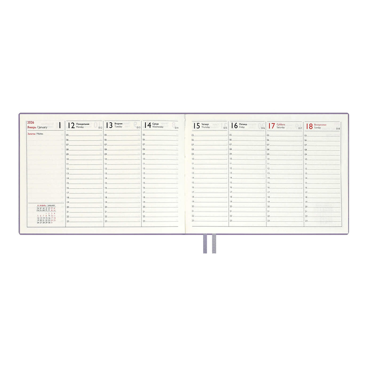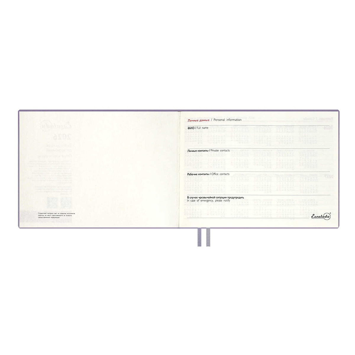 Еженедельник датированный 2026 ESCALADA, 181х127 мм, 64 л., арт. 70344/ 20 ДЖУТ СИРЕНЕВЫЙ (кожзам: мягкий переплёт, запаянный край, материал обложки: искусственная кожа "Джут", декор: блинтовое тиснение, способ крепления блока: ниткошвейный, вн. блок: 64 л., кремовый офсет 70 г/м?, печать в две краски (линия), справочный материал: есть, перфорация углов блока: нет, закладка/-и: два ляссе, каптал: есть, форзац: печать пантоном, персонализация возможна: да, индивидуальная упаковка: ПЭТ-пакет)