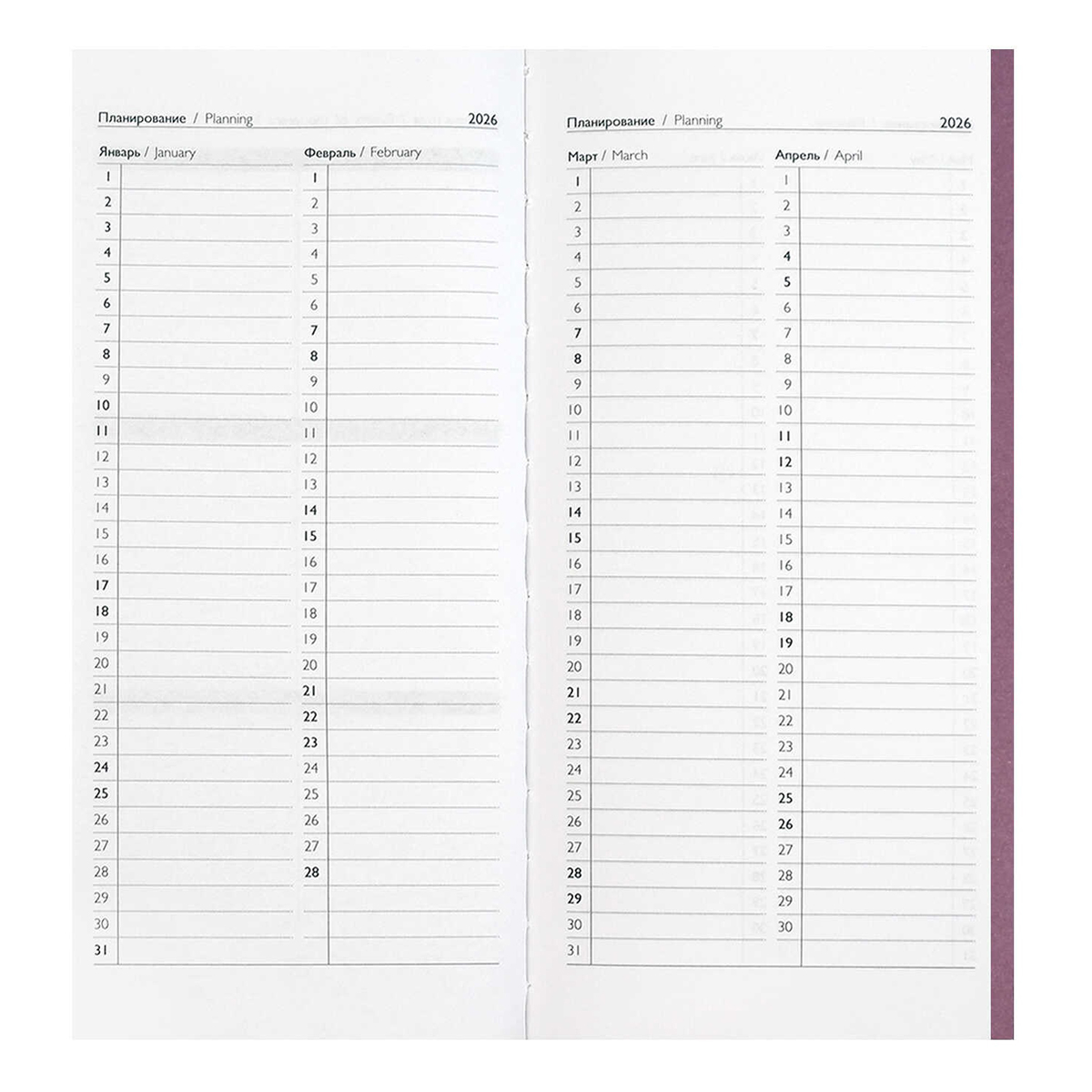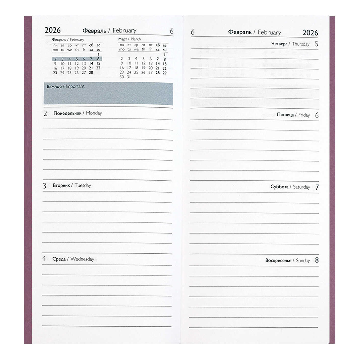 Еженедельник датированный 2026 ESCALADA, 80х165 мм, 64 л., арт. 70372/ 40 ТИВОЛИ-ГЛОСС СИРЕНЕВЫЙ (кожзам: мягкий переплёт, материал обложки: искусственная кожа "Тиволи глосс", декор: блинтовое тиснение, способ крепления блока: ниткошвейный, вн. блок: 64 л., белый офсет 70 г/м?, печать в одну краску (линия), справочный материал: есть, перфорация углов блока: нет, отделка среза: окрашивание пантоном, закладка/-и: нет, каптал: нет, форзац: печать пантоном, персонализация возможна: да, индивидуальная упаковка: ПЭТ-пакет)