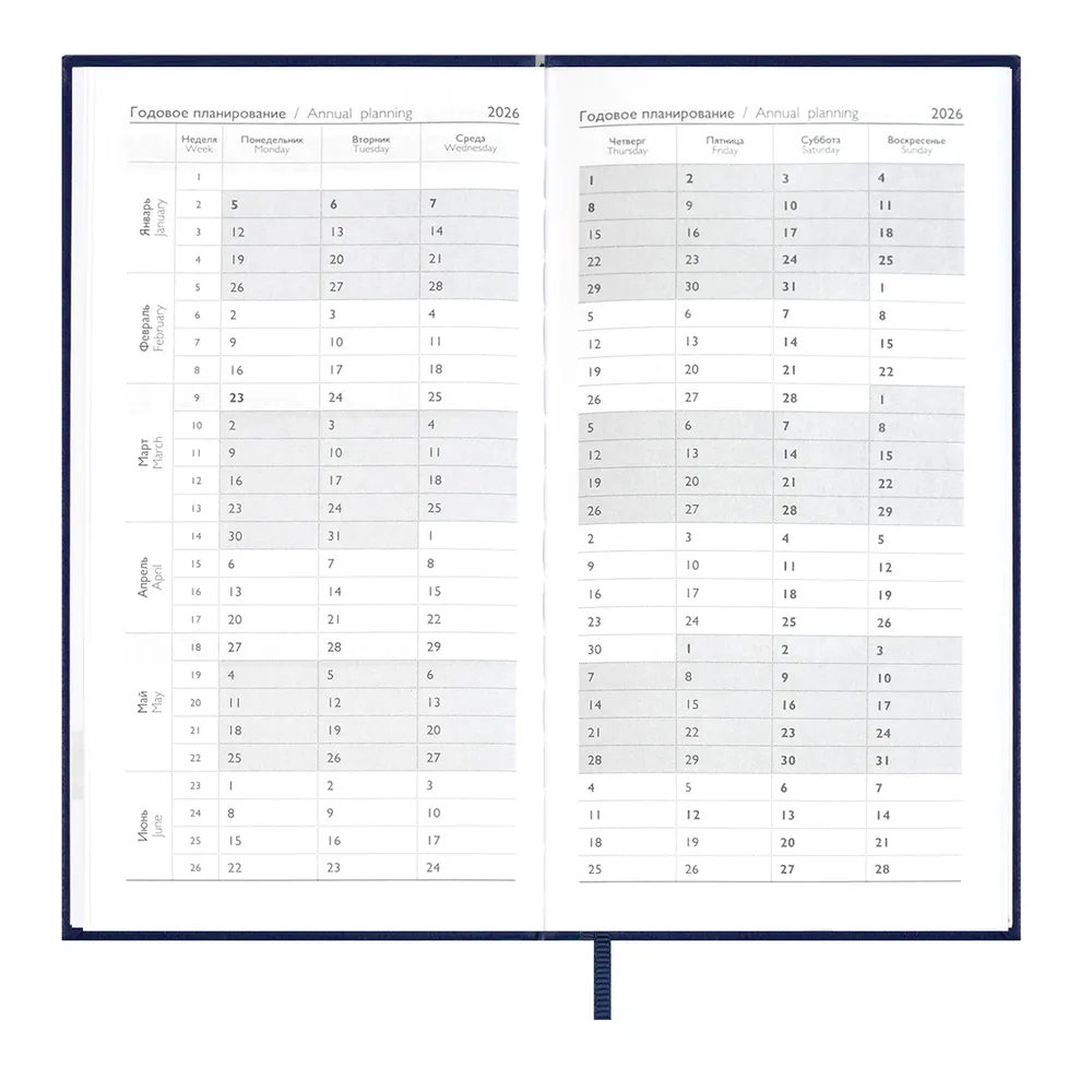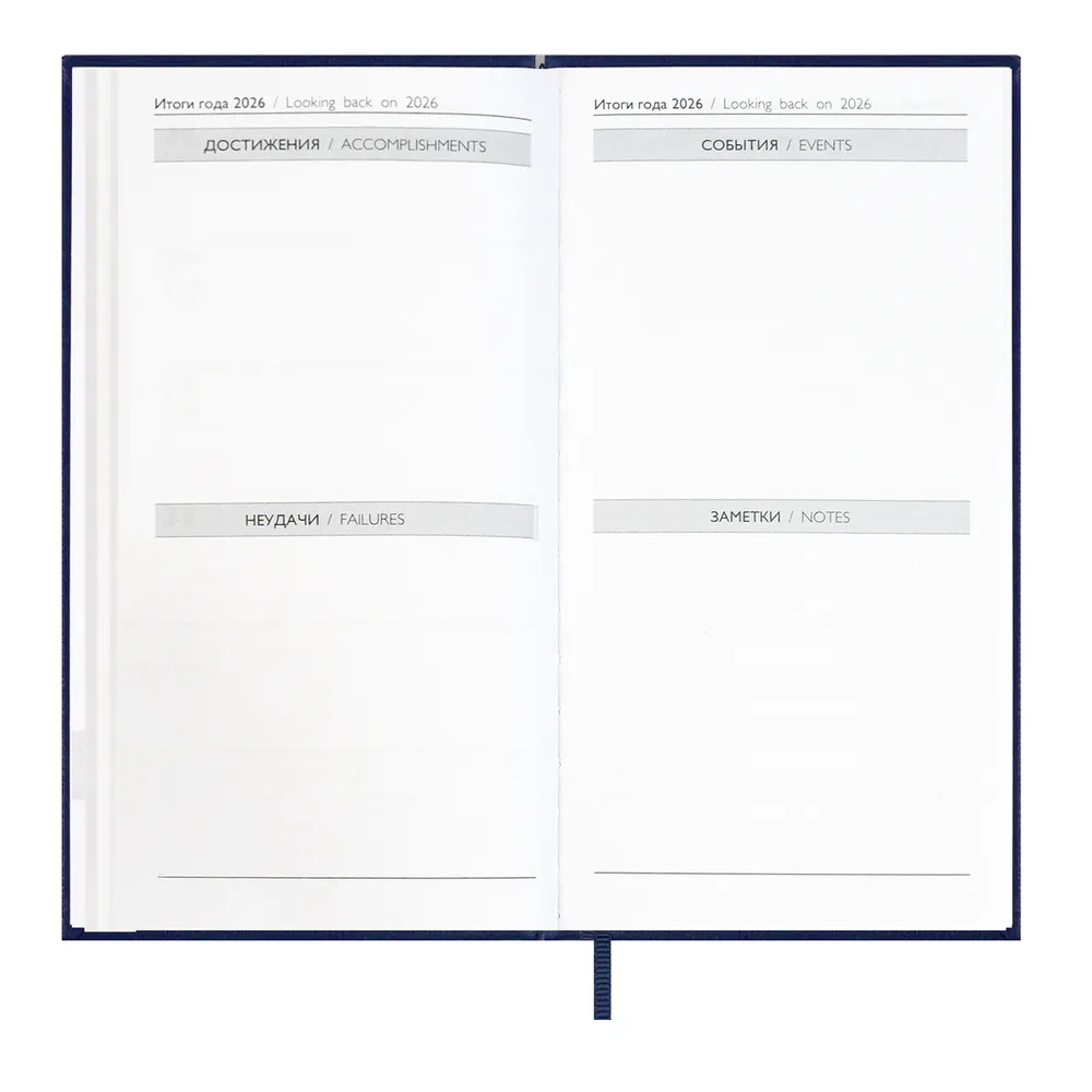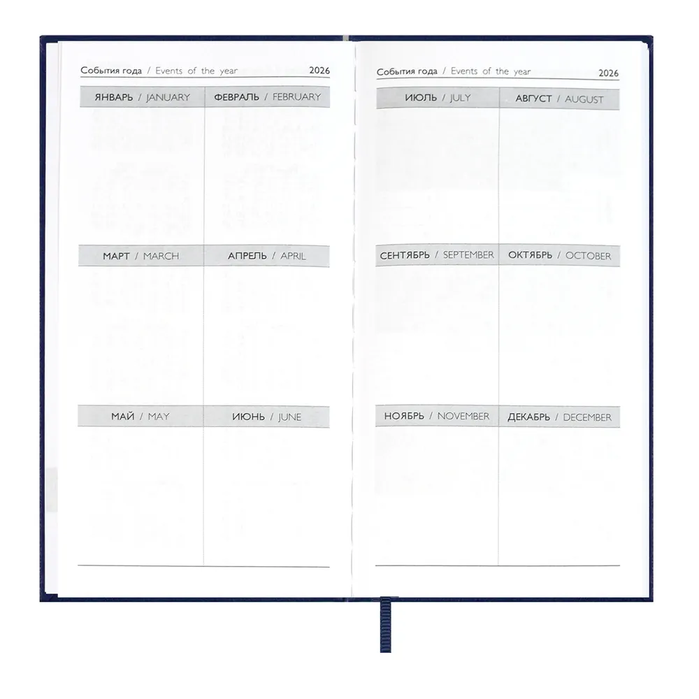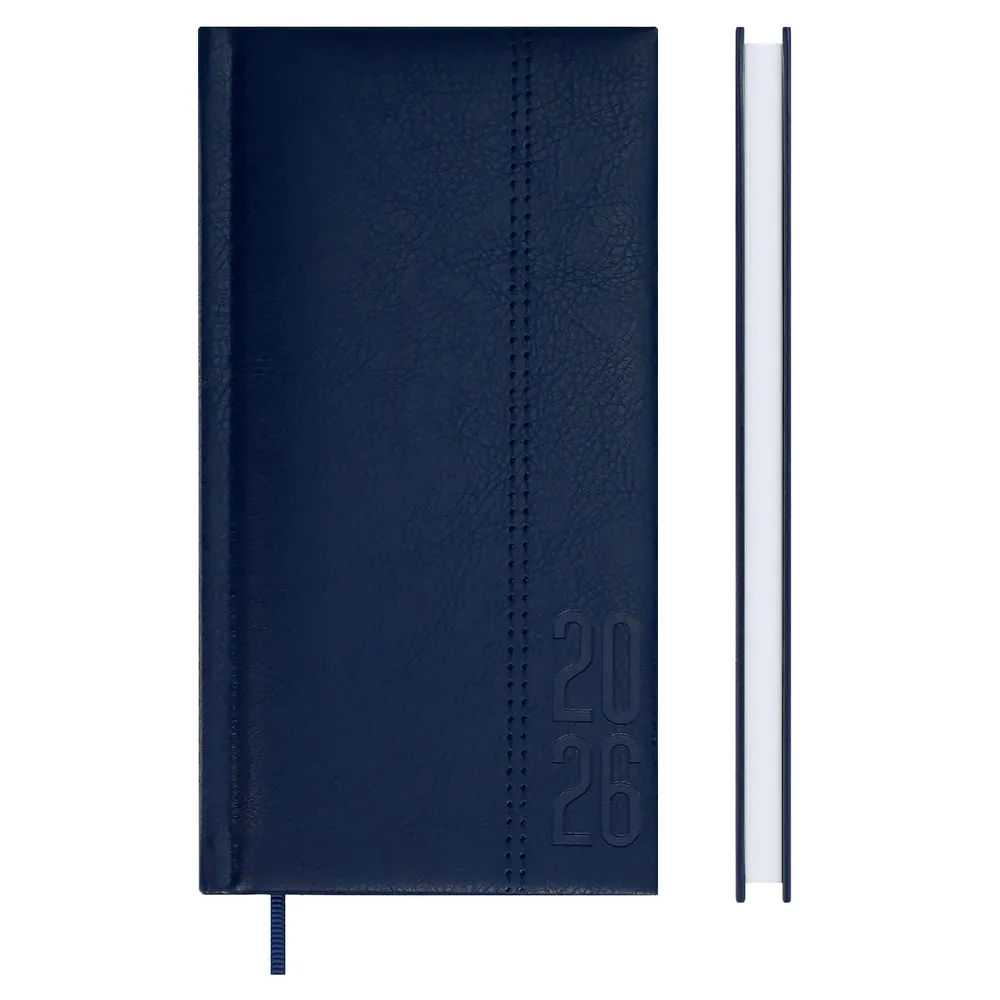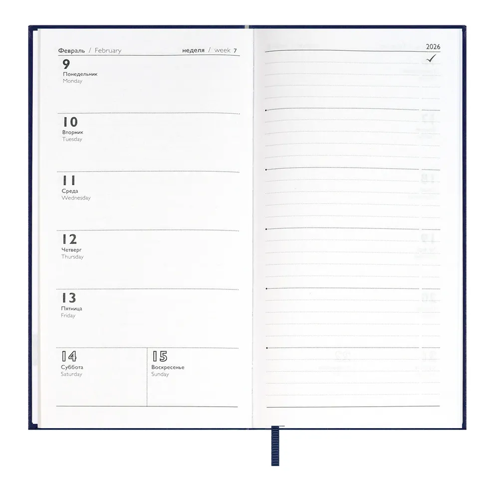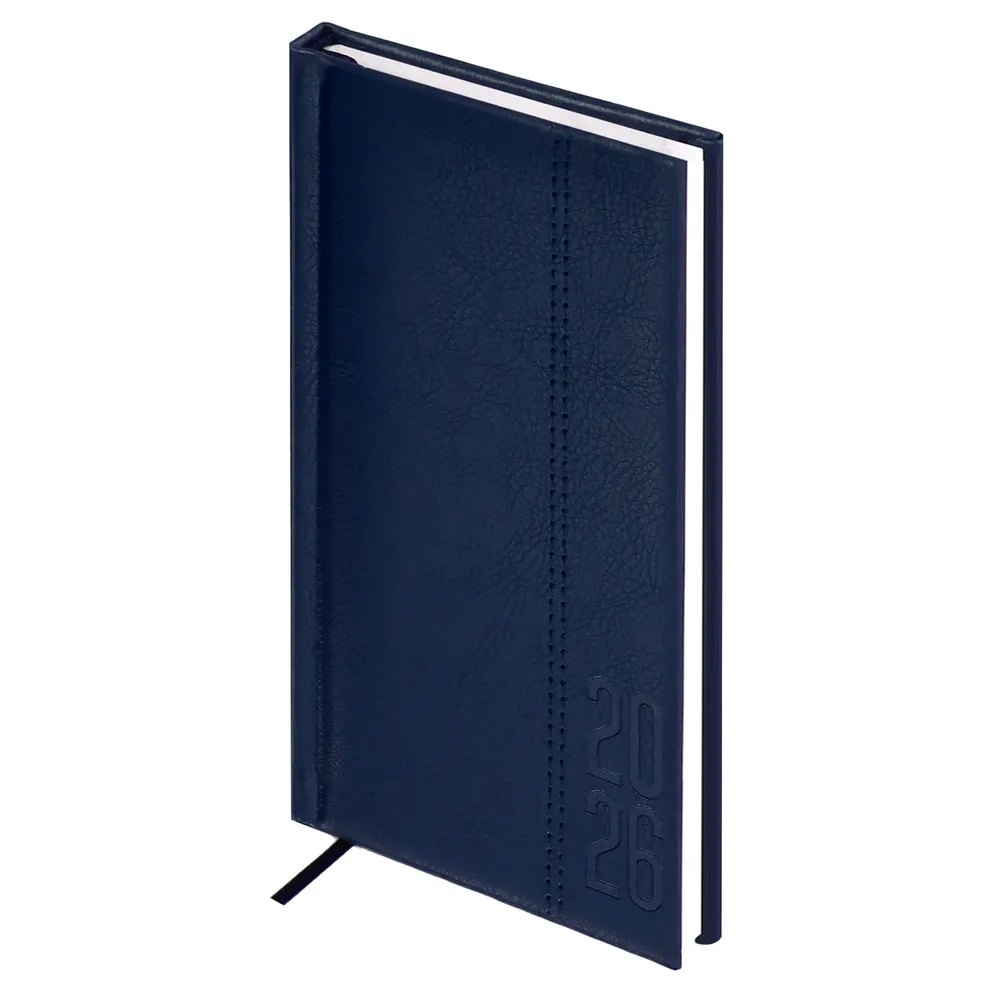 Еженедельник датированный 2026 ESCALADA, 87x166 мм, 64 л., арт. 70366/ 40 НАППА СИНИЙ (кожзам: твёрдый переплёт, материал обложки: искусственная кожа "Наппа", декор: блинтовое тиснение, отделочная строчка, способ крепления блока: ниткошвейный, вн. блок: 64 л., белый офсет 70 г/м?, печать в одну краску (линия), справочный материал: есть, перфорация углов блока: нет, закладка/-и: одно ляссе, каптал: есть, форзац: без печати, персонализация возможна: да, индивидуальная упаковка: ПЭТ-пакет)