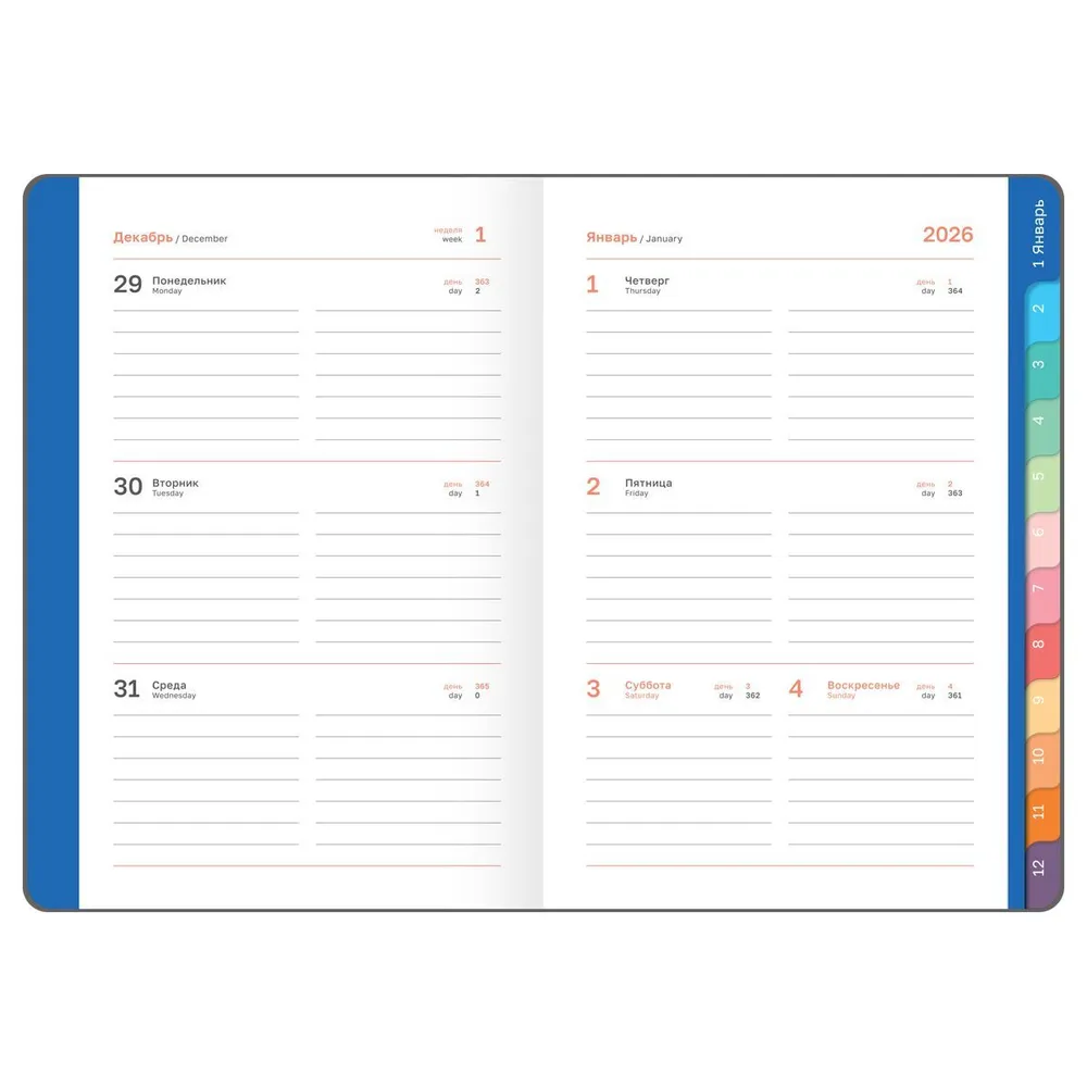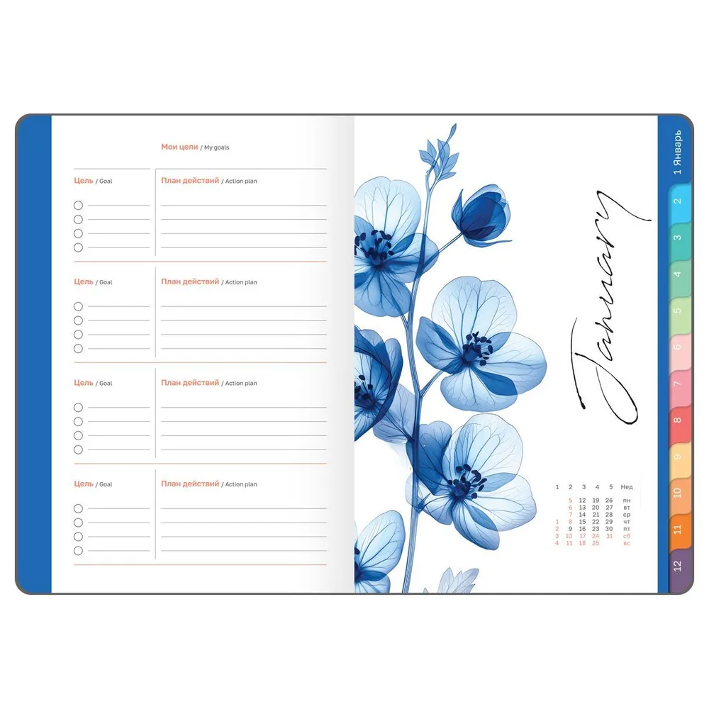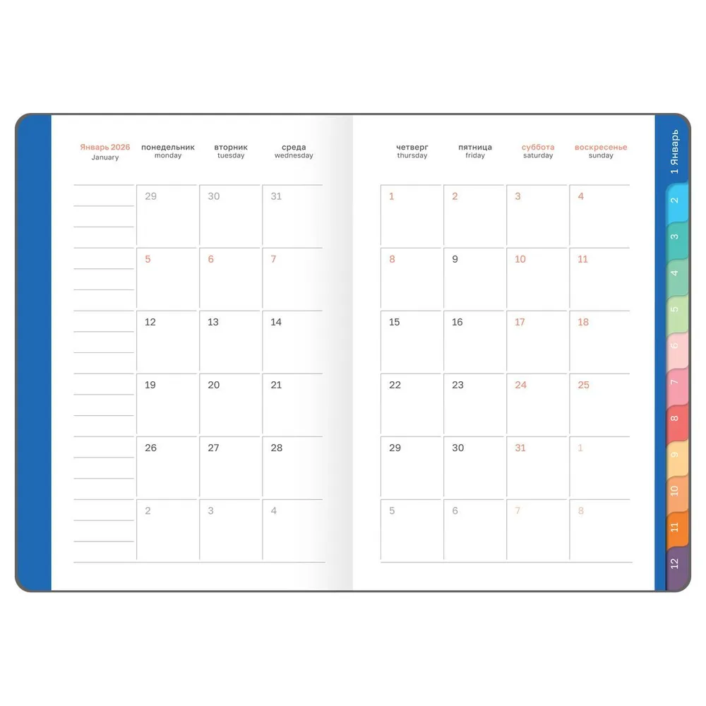 Планирование недели становится проще, когда вся информация доступна на одном развороте. Элегантная закладка обеспечивает быстрый доступ к нужной странице. Содержит календарь на 2 года, листы для записи контактов, заметок и зарисовок. Индивидуальная упаковка гарантирует его сохранность.