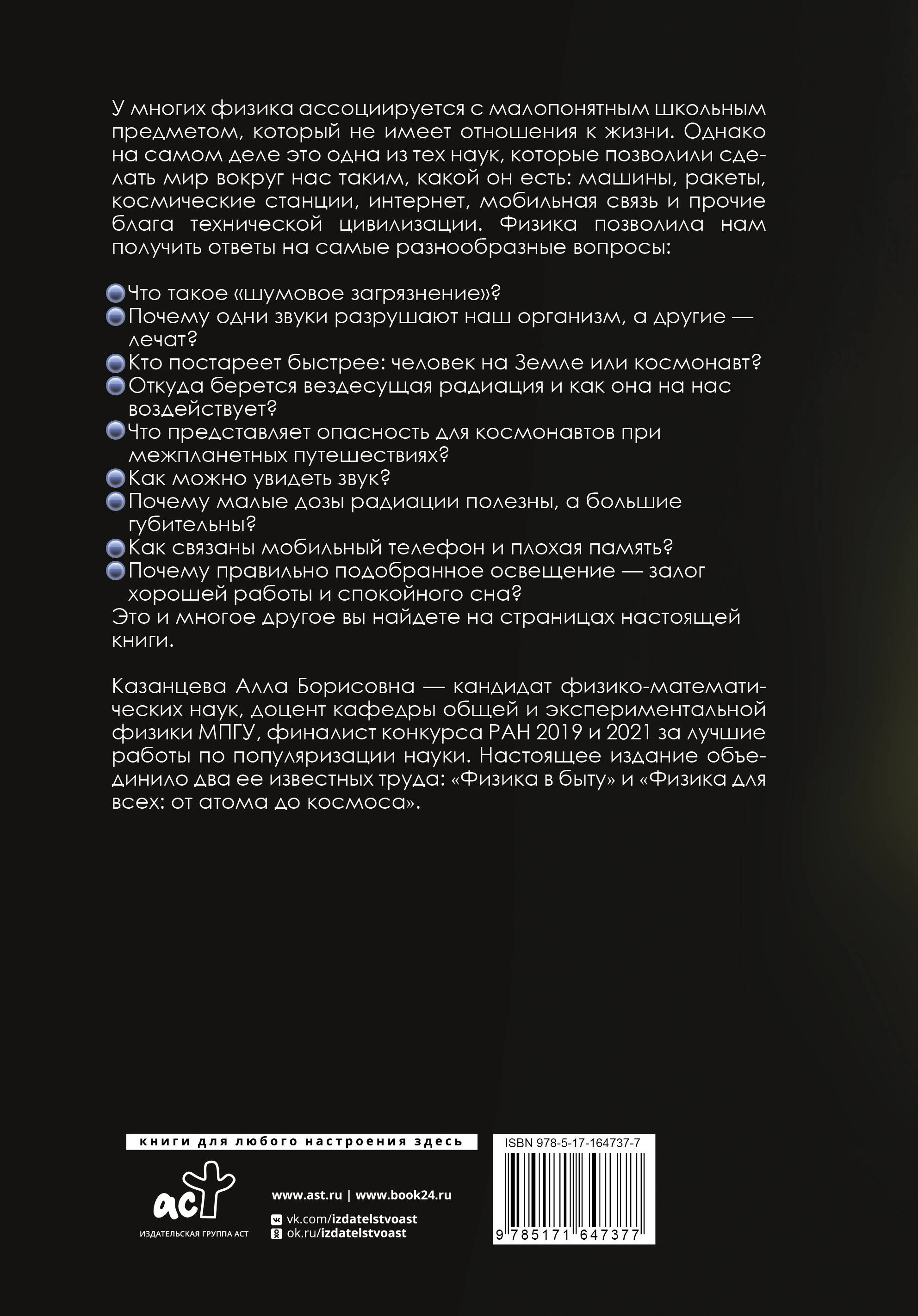 Казанцева Алла Борисовна — кандидат физико-математических наук, доцент кафедры общей и экспериментальной физики МПГУ, финалист конкурса РАН 2019 и 2021 за лучшие работы по популяризации науки. Настоящее издание объединило два ее известных труда: ≪Физика в быту≫ и ≪Физика для всех: от атома до космоса≫.