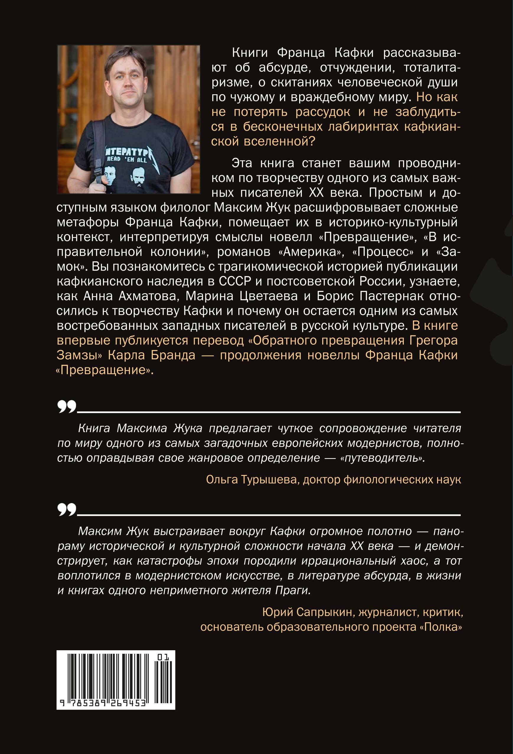 Книга посвящена творчеству Франца Кафки в контексте культуры и литературы ХХ века. В ней показаны исторический и культурный контексты, сформировавшие писателя, очерчены контуры его художественного мира, представлены различные варианты интерпретаций ключевых произведений Кафки: новеллы «Превращение» и романов «Америка», «Процесс», «Замок». Отдельная часть посвящена восприятию наследия писателя в русской культуре и судьбе публикации его произведений в СССР. Впервые на русском языке опубликована новелла Карла Бранда «Обратное превращение Грегора Замзы» (1916) – продолжение кафкианской новеллы «Превращение» (1912).