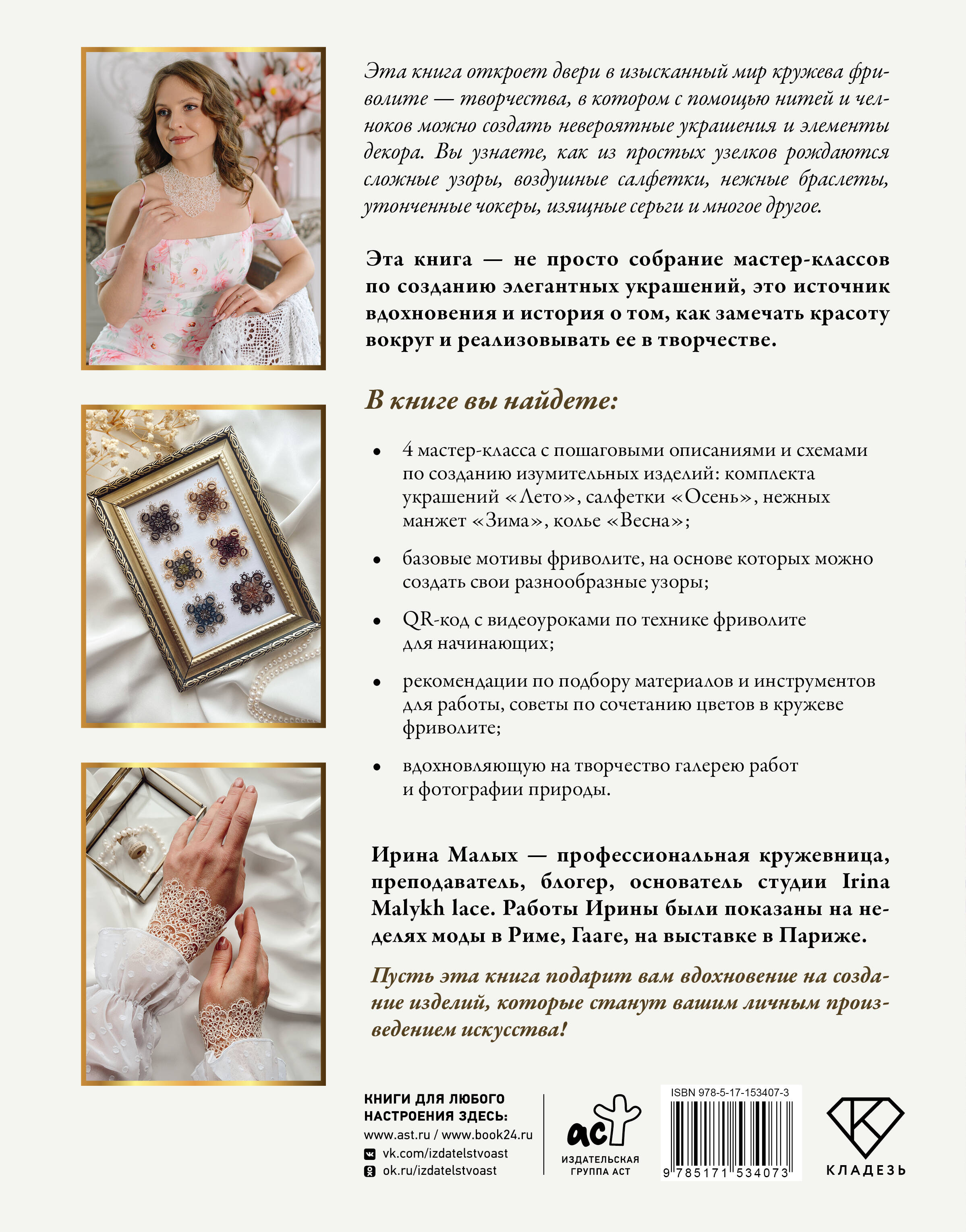 Эта книга — не просто собрание мастер-классов по созданию элегантных украшений, это источник вдохновения и история о том, как замечать красоту вокруг и реализовывать ее в творчестве. Вы узнаете, как с помощью нитей и челноков из простых узелков рождаются сложные узоры, воздушные салфетки, нежные браслеты, утонченные чокеры, изящные серьги и многое другое.