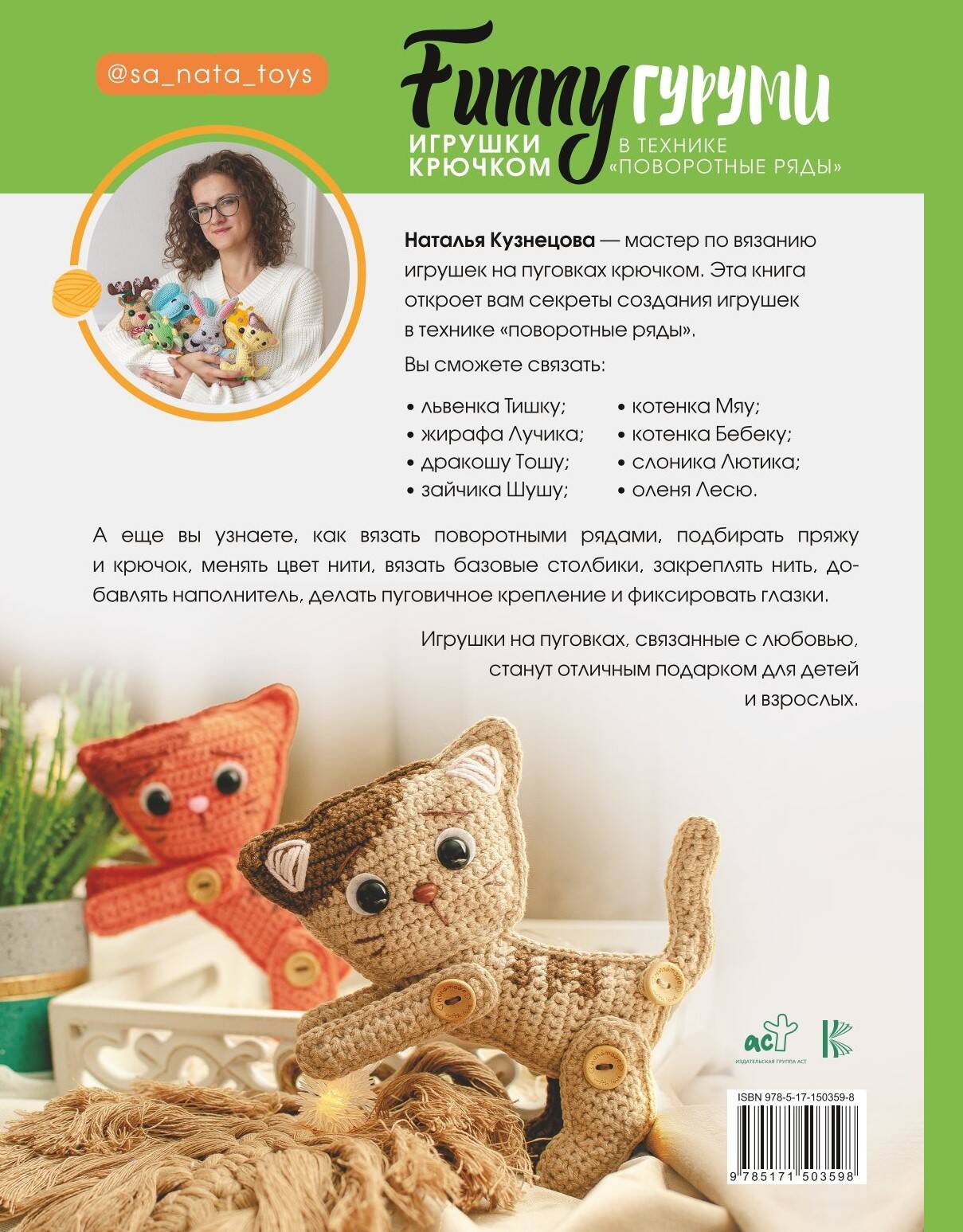 В этой книге собрано 8 мастер-классов по вязанию игрушек на пуговицах в технике "поворотные ряды". Вы сможете связать львенка, жирафа, дракона, зайчика, слоника, оленя и двух котят. В этом вам помогут рекомендации автора по выбору пряжи и крючка, базовые элементы вязания крючком, инструкции, как вязать поворотными рядами, а также советы, как оформлять игрушки.