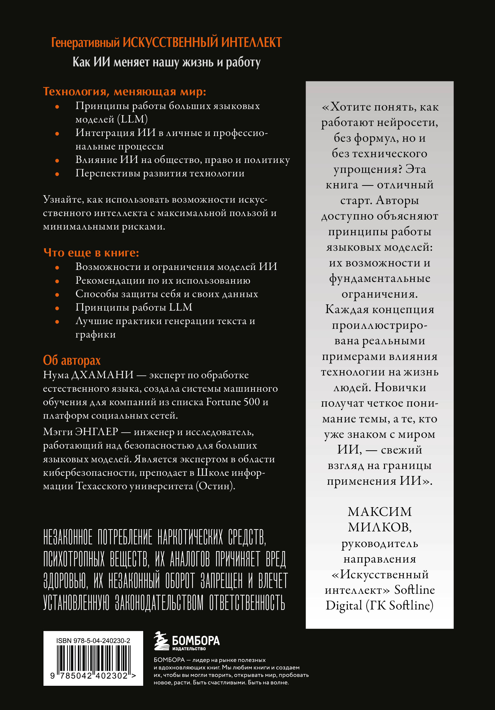 «Хотите понять, как работают нейросети, без формул, но и без технического упрощения? Эта книга — отличный старт. Авторы доступно объясняют принципы работы языковых моделей: их возможности и фундаментальные ограничения. Каждая концепция проиллюстрирована реальными примерами влияния технологии на жизнь людей. Новички получат четкое понимание темы, а те, кто уже знаком с миром ИИ, — свежий взгляд на границы применения ИИ». — Максим МИЛКОВ, руководитель направления «Искусственный интеллект» Softline Digital (ГК Softline)