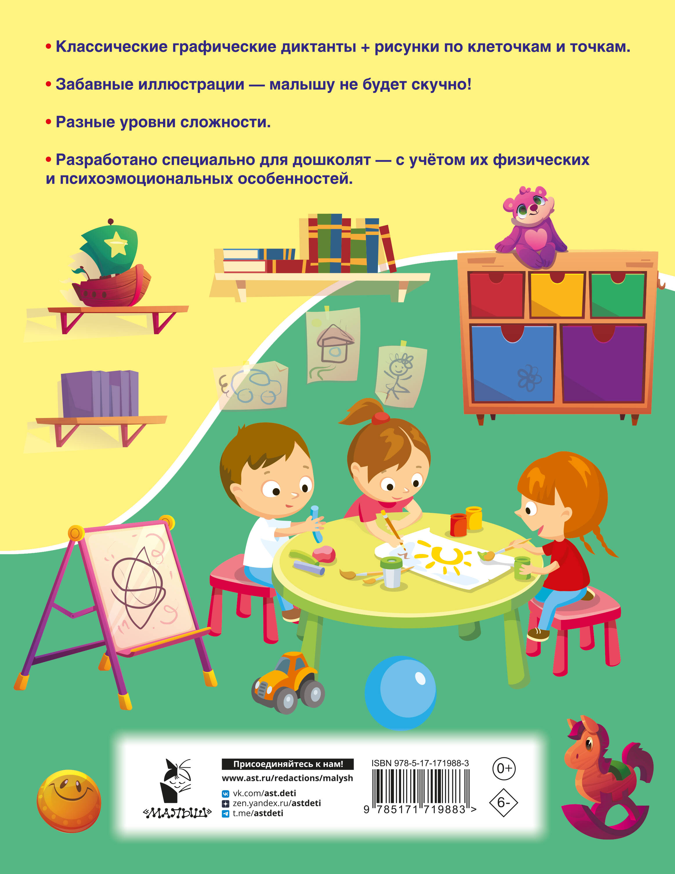 Весело шагаем по клеточкам и получаем суперполезные навыки для будущего успешного обучения в школе! Тренажёр «Графические диктанты» разработан специально для детского сада — с учётом физических и психоэмоциональных особенностей дошколят. На 64 страницах формата А4 вы найдёте задания на любой вкус и разных уровней сложности. Малыш прекрасно проведёт время в компании забавных героев и заодно улучшит навыки письма, потренирует точность движений, разовьёт пространственное мышление и зрительную память, станет более внимательным и сосредоточенным. Уроки без скуки — то, что надо! Сделайте замечательный подарок вашему ребёнку!