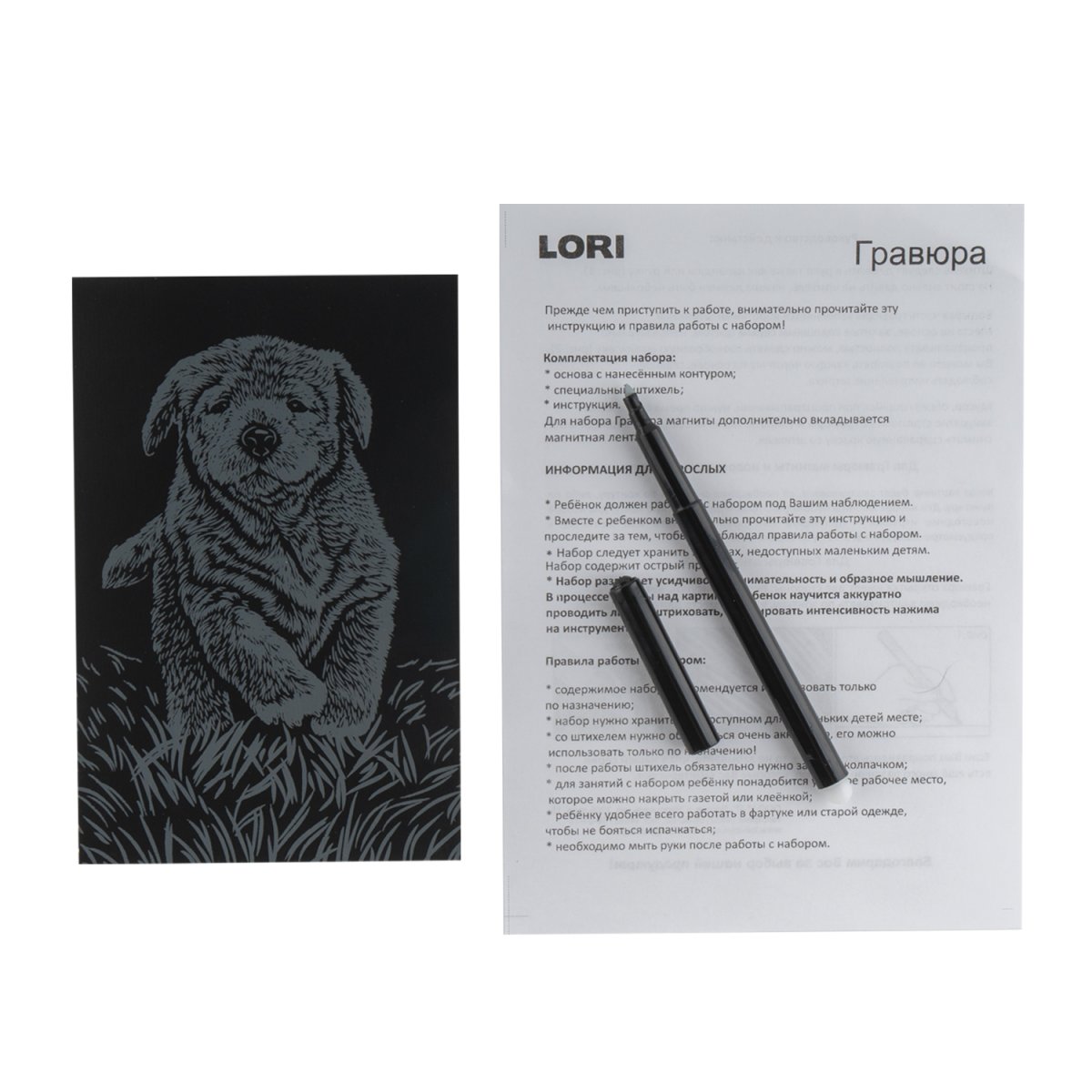 Гравюра представляет собой многослойное панно, покрытое чёрной краской, на которое нанесён контур рисунка. Техника создания гравюры увлекательна и достаточно проста. Необходимо лишь взять штихель – особый скребок, входящий в состав набора, и процарапать рисунок гравюры. Работа с гравюрой развивает усидчивость, внимательность и образное мышление.