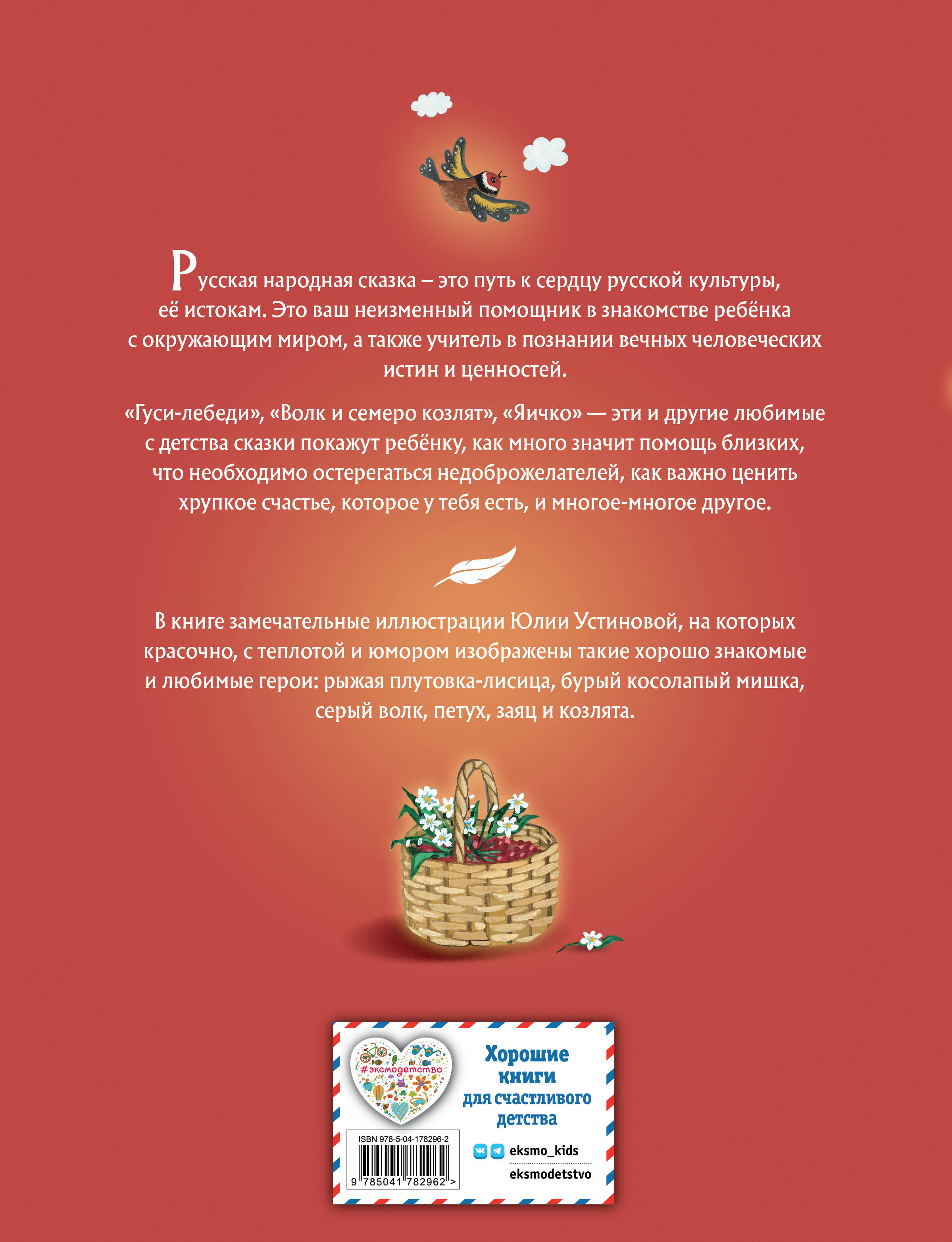 В сборник вошло 20 известных русских народных сказок: «Волк и семеро козлят», «Журавль и цапля», «Гуси-лебеди», «Морозко» и другие.