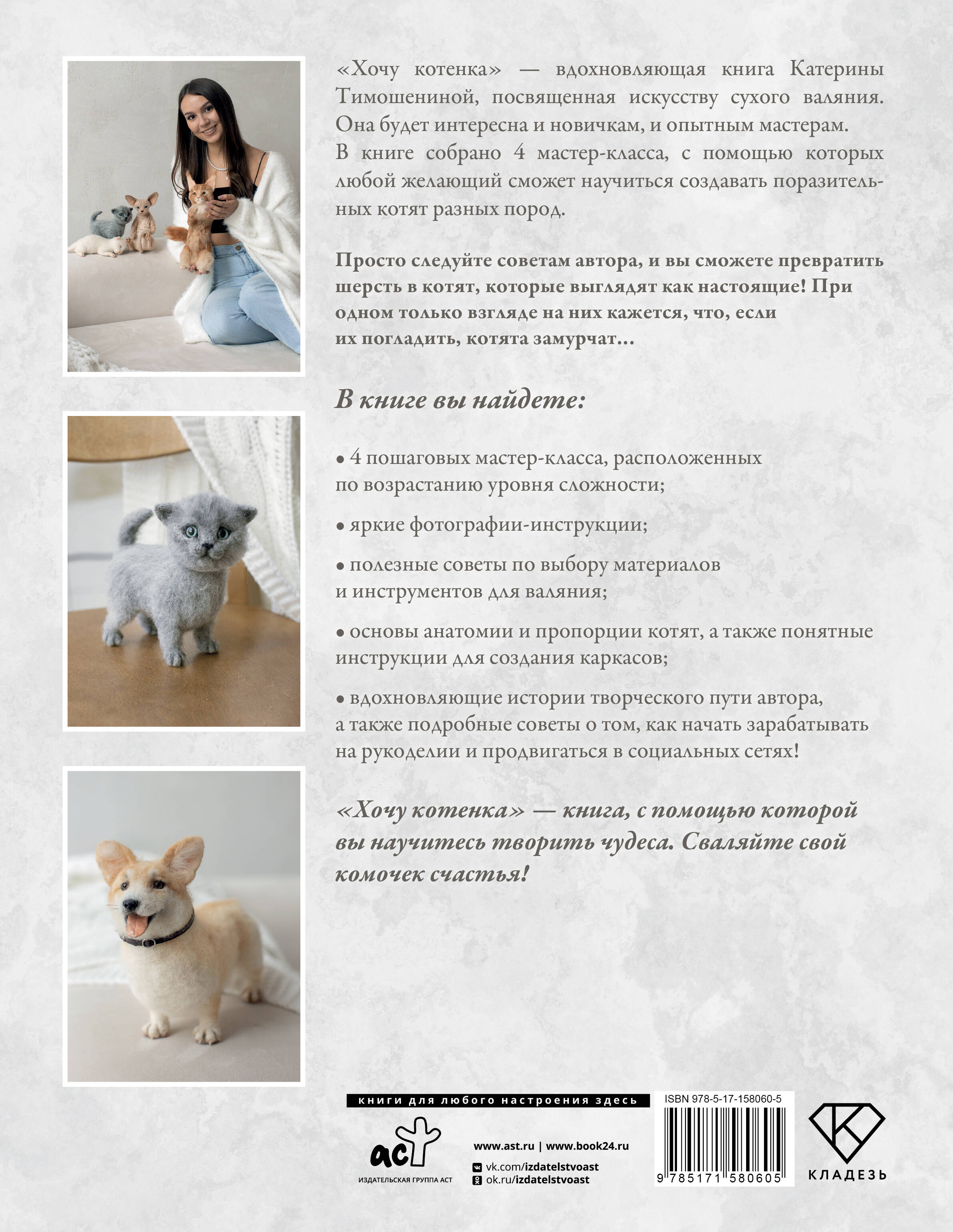 В этой книге собрано 4 подробных мастер-класса по созданию реалистичных котят разных пород в технике сухого валяния. Они расположены в порядке возрастания уровня сложности, поэтому книга подойдет как новичкам, так и опытным мастерам. Также в ней вы найдете яркие фотографии, подробные описания, интересную информацию о разных породах кошек, представленных в книге, и советы автора о том, как начать продавать изделия ручной работы и продвигаться в социальных сетях. Сваляйте свой комочек счастья!
