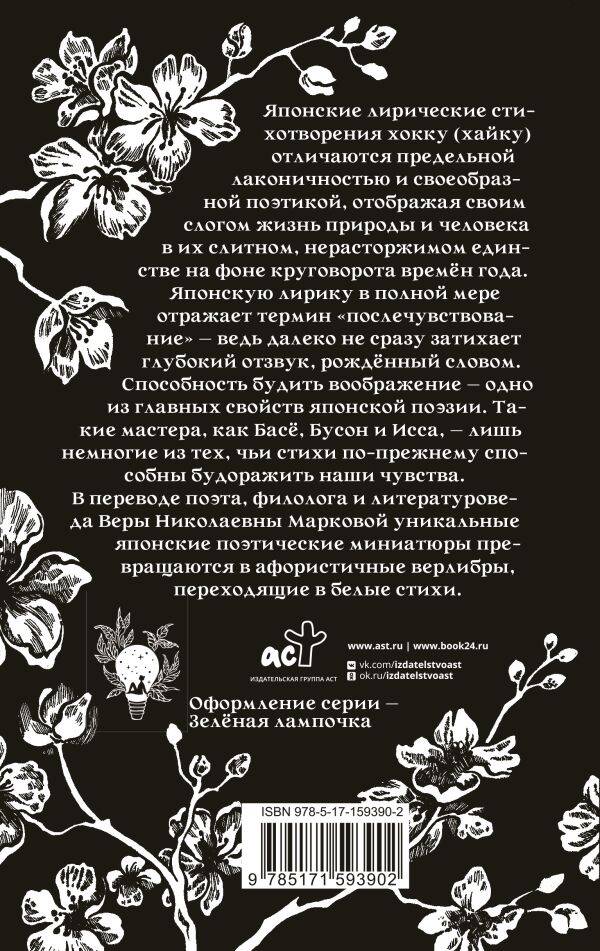 В переводе поэта, филолога и литературоведа Веры Николаевны Марковой уникальные японские поэтические миниатюры превращаются в афористичные верлибры, переходящие в белые стихи.