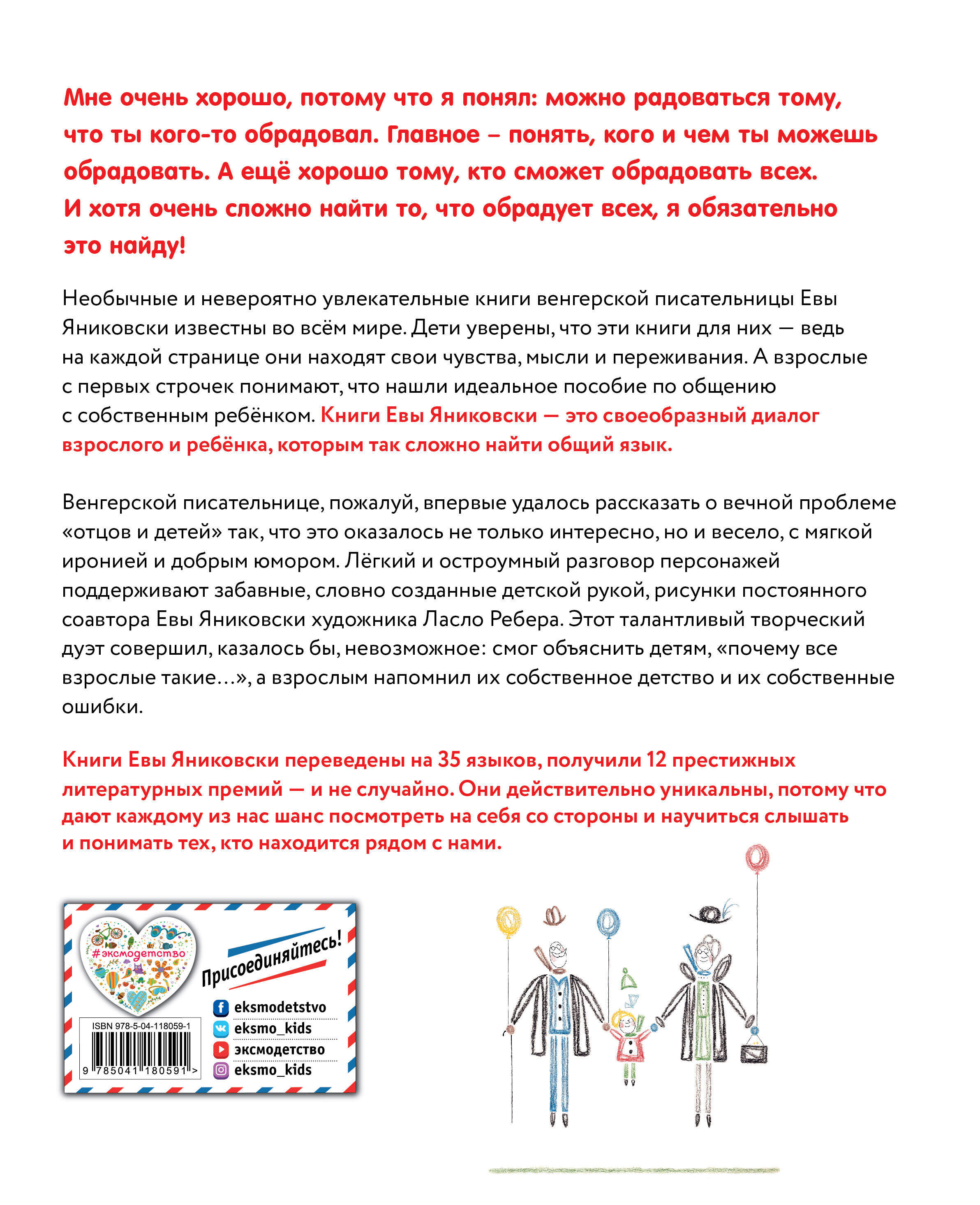 Главная особенность уникальных книг Евы Яниковски — это удивительная ёмкость и простота коротких текстов, которые с безупречной точностью раскрывают внутренний мир ребёнка. А кроме того, это своеобразный диалог на нестандартные темы между детьми и взрослыми, который помогает сократить разрыв между поколениями.
