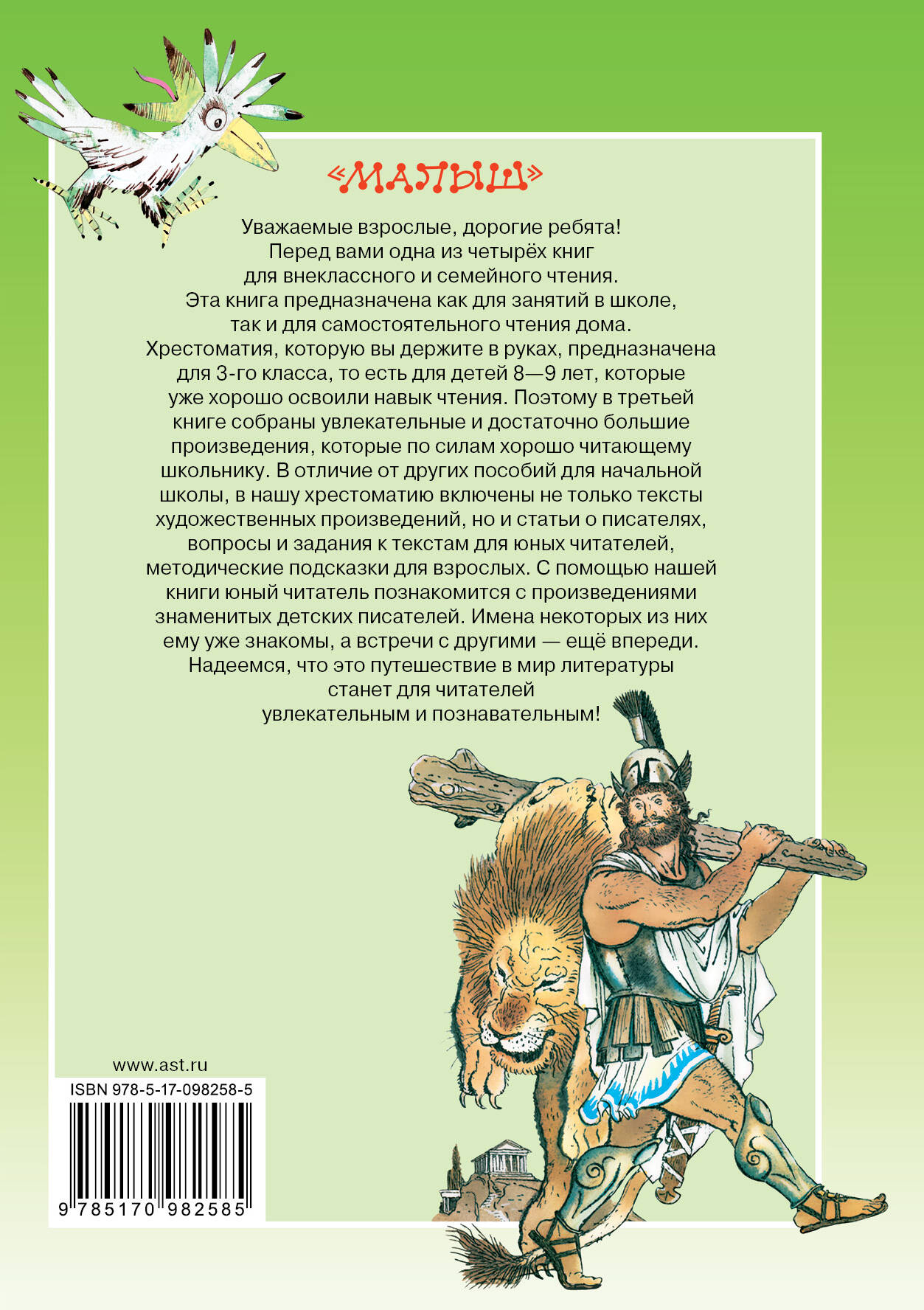 Уважаемые взрослые, дорогие ребята! Перед вами одна из четырех книг хрестоматий по чтению. Эта книга предназначена как для занятий в школе, так и для самостоятельного чтения дома. Хрестоматия, которую вы держите в руках, предназначена для 3 класса, то есть для детей 8 - 9 лет, которые уже хорошо освоили навык чтения. Поэтому в третьей книге собраны увлекательные и достаточно большие произведения, которые по силам хорошо читающему школьнику. В отличие от других пособий для начальной школы, в нашу хрестоматию включены не только тексты художественных произведений, но и статьи о писателях, вопросы и задания к текстам для юных читателей, методические подсказки для взрослых. С помощью нашей книги юный читатель познакомится с произведениями знаменитых детских писателей. Имена некоторых из них ему уже знакомы, а встречи с другими - ещё впереди. Надеемся, что это путешествие в мир литературы станет для читателей увлекательным и познавательным!