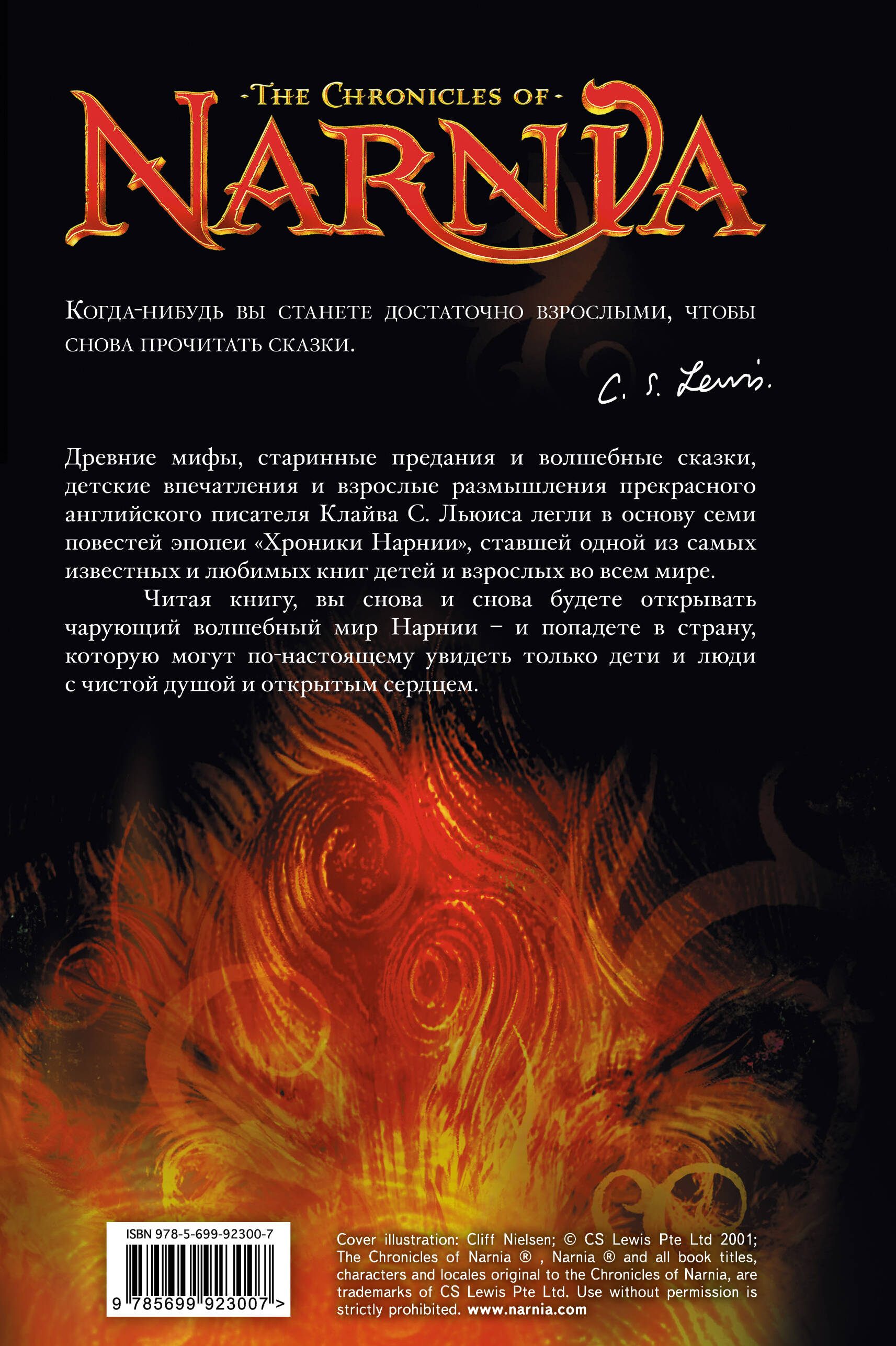 Древние мифы, старинные предания и волшебные сказки, детские впечатления и взрослые размышления английского писателя Клайва С. Льюиса легли в основу семи повестей эпопеи «Хроники Нарнии» — самой любимой и известной книги во всем мире.