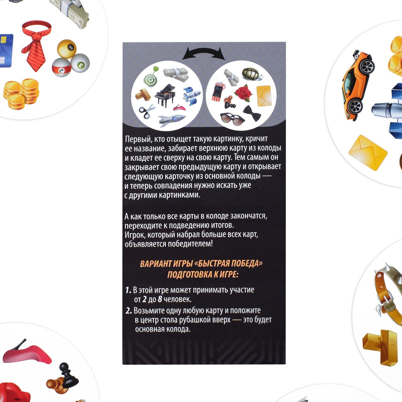 Первый, кто отыщет такую картинку, кричит её название, забирает верхнюю карту из колоды и кладет её сверху на свою карту. Тем самым он открывает следующую карточку из основной колоды. Теперь совпадения нужно искать уже с другими картинками.