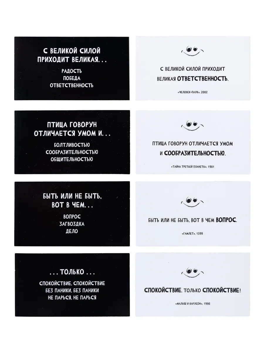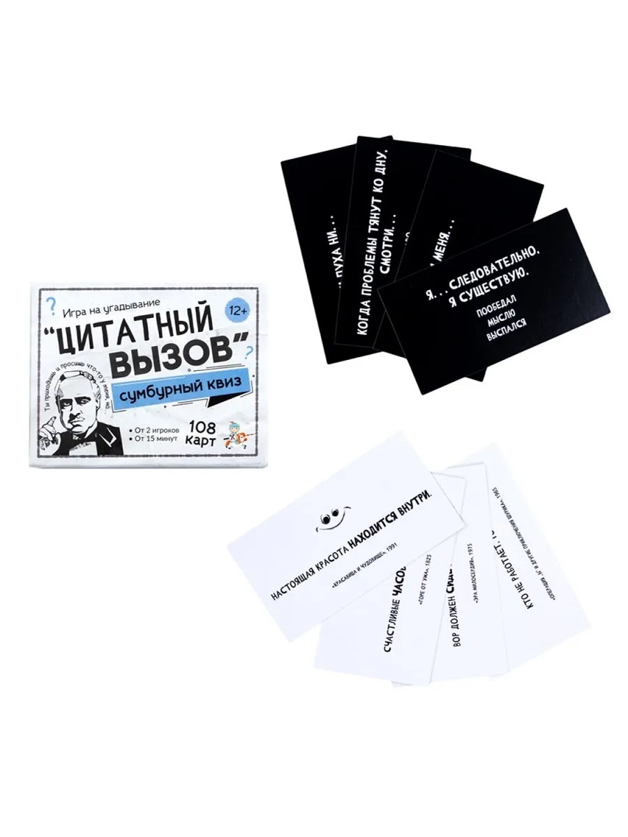 Настольная игра для большой компании "Сумбурный квиз. Цитатный вызов" - это интеллектуально-развлекательная игра, в которой игроки соревнуются в знании известных цитат.