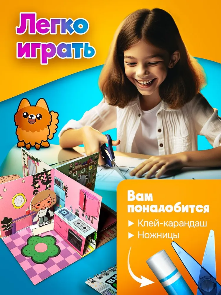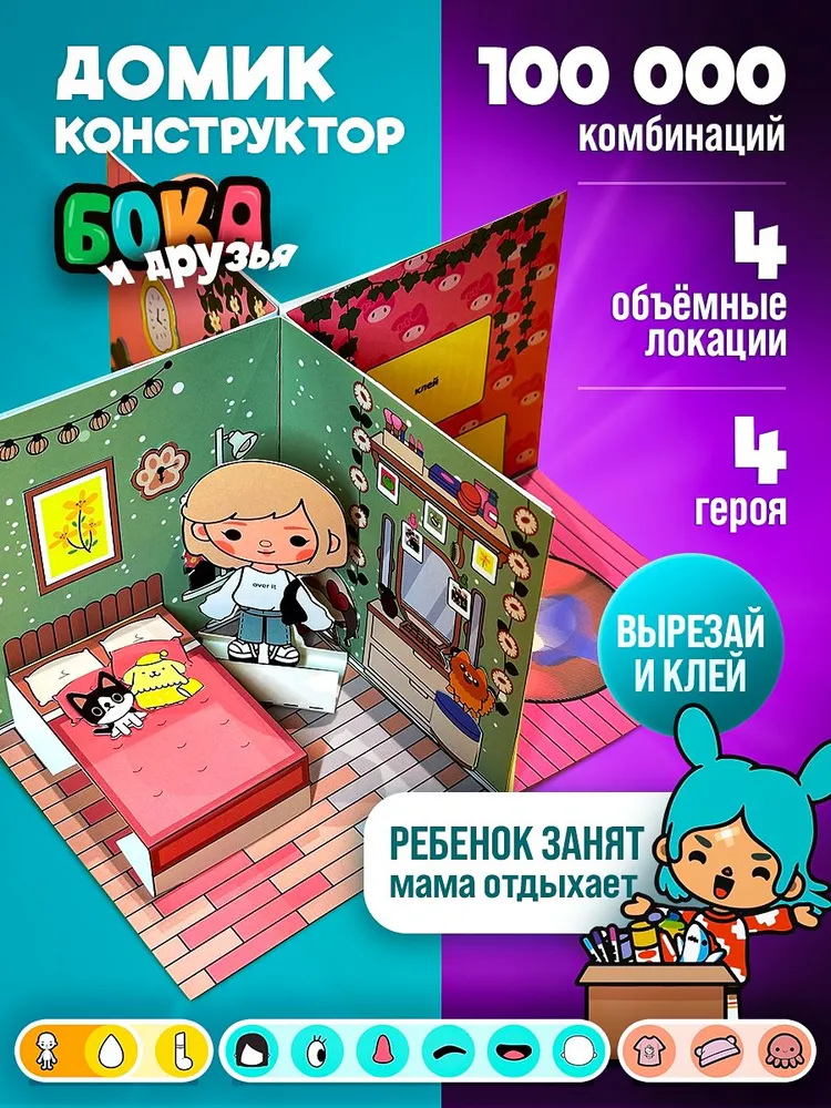 Бумажный 3D домик и кукла Toca Boca Life – это увлекательная популярная книга вырезалка для девочек и развивающая игра сделай сам. В набор входит 4 любимых куклы, украшения, предметы мебели и декор для 4 локаций: кухня, спальня, гостиная и ванна из мира Boca Life World. Героев, одежду, предметы - всё можно вырезать из альбома и создавать уникальные образы для персонажей и придумывать новые истории и приключения. Альбом состоит из 7 листов - это современный творческий набор для детей и взрослых который погружает вас в мир моды и стиля для создания собственных модных историй. Вырезайте из альбома куколок, украшения и предметы для комнат. Для игры возьмите любой детский клей-карандаш, ножницы и включайте фантазию. Соберите из макета комнаты 3-х сторонний кубик. А затем склейте или просто сдвиньте 4 комнаты стена к стене - у вас получится целый дом для героев куроми тамагочи. Приклеивайте предметы интерьера и домашние украшения внутри помещений так, как указывают шпаргалки (надпись “клей” подсказывает, что к этому элементу крепится другой элемент подходящей формы). Помещайте персонажей в любимую локацию и украсьте ее идеально подходящим декором.