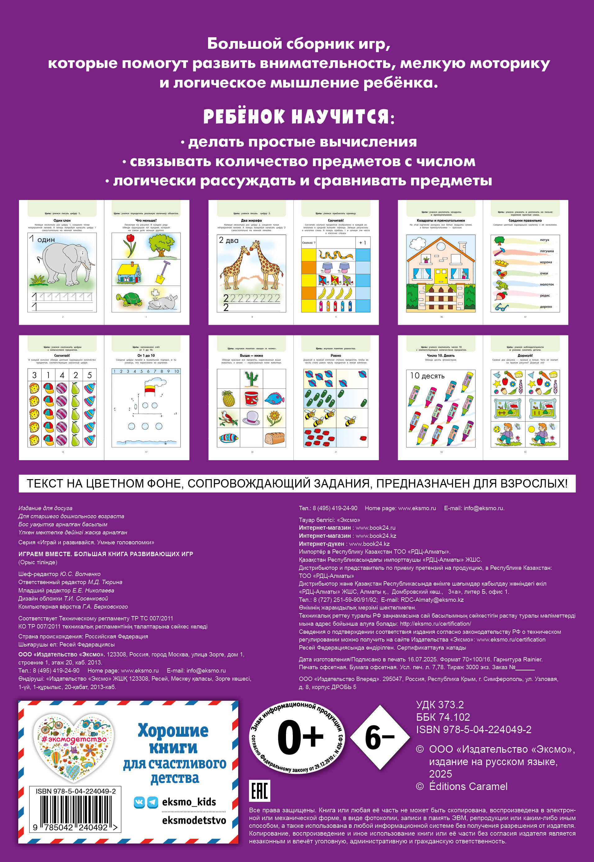 Проведите время с ребенком весело и познавательно! Перед вами — большой сборник развивающих игр для совместных занятий с ребенком возраста от 4 лет. Упражнения, включенные в сборник, направлены на развитие логического мышления, мелкой моторики и внимательности. Внутри вы найдете лабиринты, раскраски по номерам, игры на вычисление количества предметов и на понимание противоположных понятий, а также другие задания, которые малышу обязательно захочется пройти. Каждая игра сопровождается кратким описанием для родителей. Яркие цветные крупные иллюстрации, расположенные на каждой странице, привлекут внимание и заинтересуют ребенка.