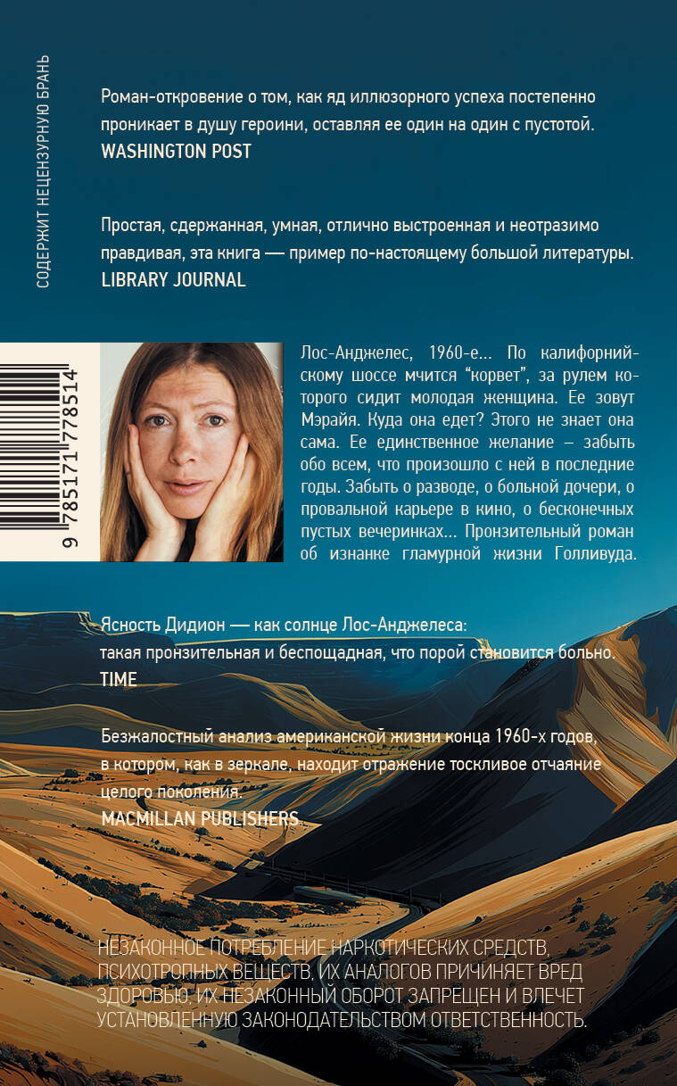 Мэрайя Уайет родилась в крошечном городе-призраке в Неваде и перебралась в Лос-Анджелес с мечтой покорить Голливуд. Молодая, красивая, умная, она не сомневалась в себе. И поначалу все складывалось прекрасно. Она нашла работу модели, снялась в главной роли в фильме, вышла замуж за известного режиссера, родила дочь. Дом с бассейном, вечеринки, разговоры ни о чем, зависть к чужим успехам, ревность к мужу, мимолетные романы и засасывающее чувство пустоты… Может быть, именно оно заставляет Мэрайю каждое утро садиться за руль своего “корвета” и на бешеной скорости мчаться куда глаза глядят?