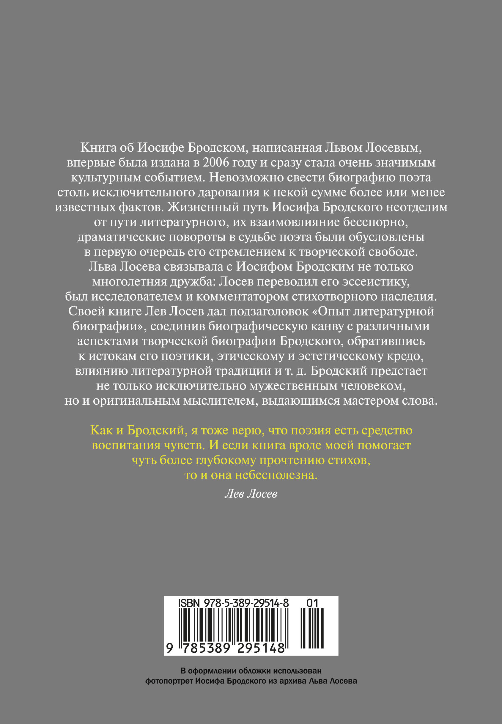 Книга об Иосифе Бродском, написанная Львом Лосевым, впервые была издана в 2006 году и сразу стала очень значимым культурным событием. Невозможно свести биографию поэта столь исключительного дарования к некой сумме более или менее известных фактов. Жизненный путь Иосифа Бродского неотделим от пути литературного, их взаимовлияние бесспорно, драматические повороты в судьбе поэта были обусловлены в первую очередь его стремлением к творческой свободе. Льва Лосева связывала с Иосифом Бродским не только многолетняя дружба: Лосев переводил его эссеистику, был исследователем и комментатором стихотворного наследия. Своей книге Лев Лосев дал подзаголовок «Опыт литературной биографии», соединив биографическую канву с различными аспектами творческой биографии Бродского, обратившись к истокам его поэтики, этическому и эстетическому кредо, влиянию литературной традиции и т. д. Бродский предстает не только исключительно мужественным человеком, но и оригинальным мыслителем, выдающимся мастером слова. Издание снабжено вклейкой с иллюстрациями и станет прекрасным подарком для всех поклонников русской поэзии.