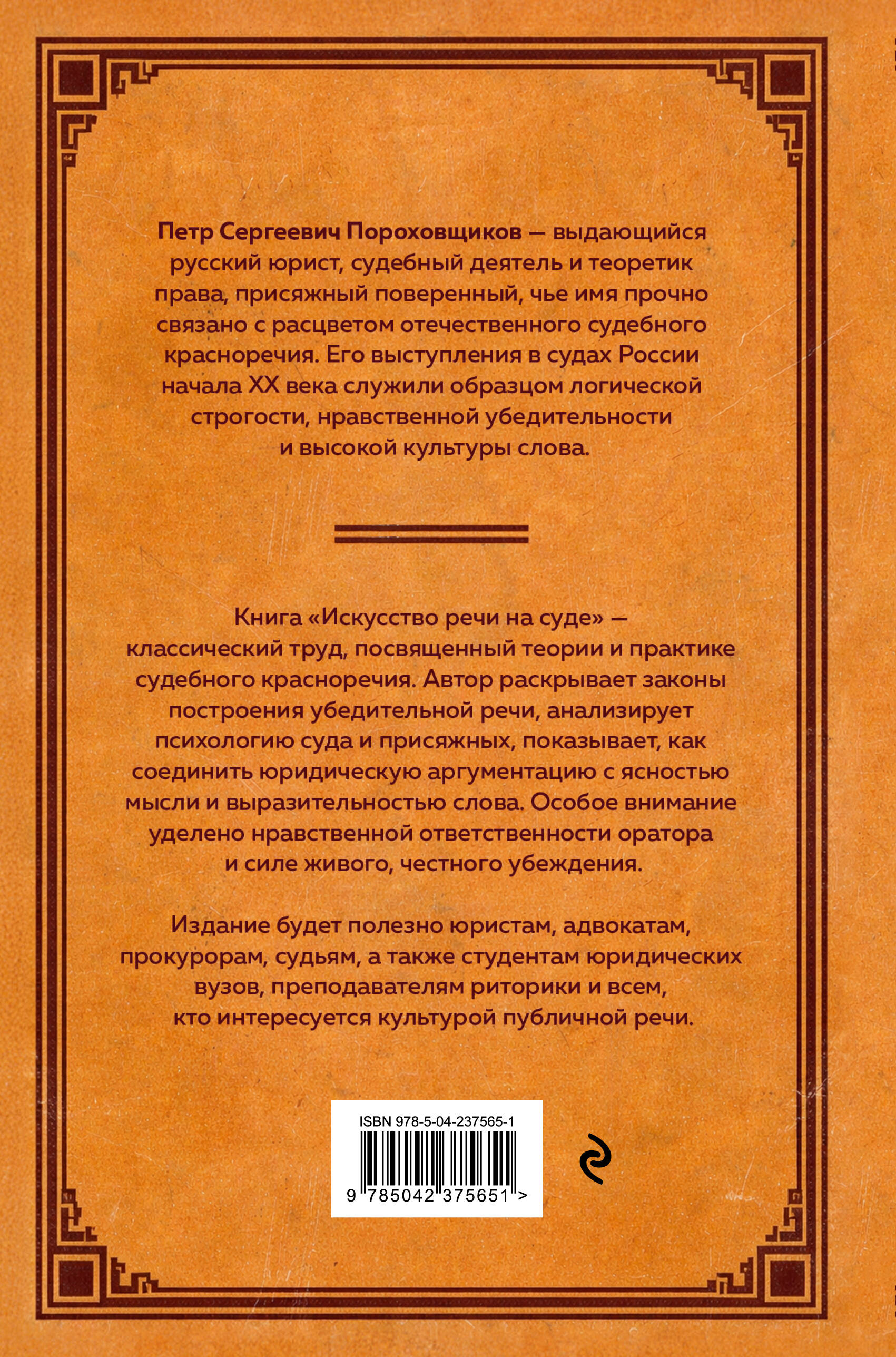 Пётр Пороховщиков, легендарный адвокат и теоретик права, показывает, как слово становится решающим аргументом. Вы узнаете, как строить доказательство, управлять вниманием слушателей и сохранять нравственную силу речи. Книга учит говорить ясно, убедительно и ответственно. Издание выполнено в ностальгическом советском стиле, отсылающем к классическим юридическим библиотекам СССР. Издание будет полезно тем, кто работает со словом в юридической среде или изучает основы публичной речи.