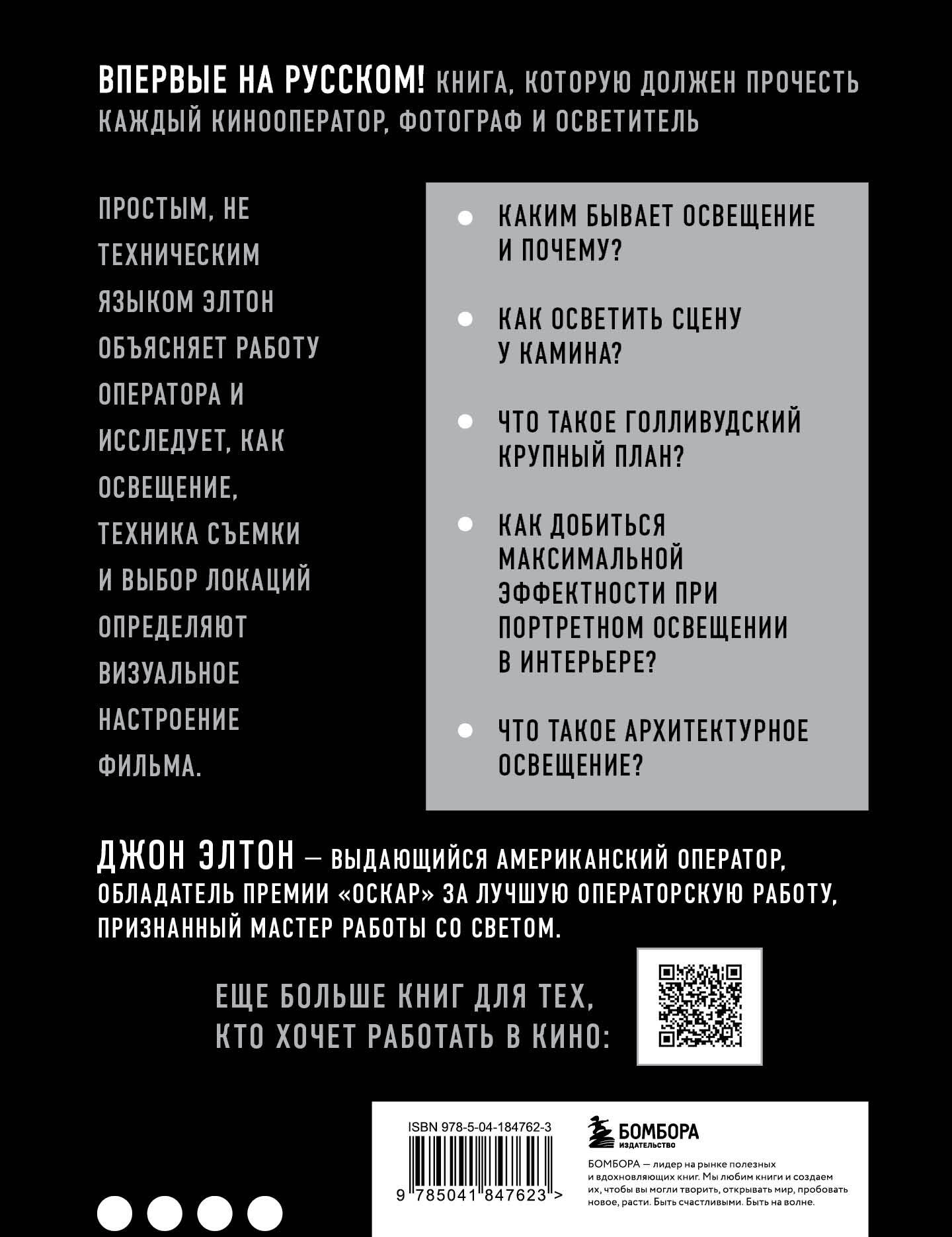 «Искусство света и тени. Как оператор создает фильм» — одна из ключевых книг по операторскому мастерству, написанная одним из признанных мастеров Голливуда Джоном Элтоном.