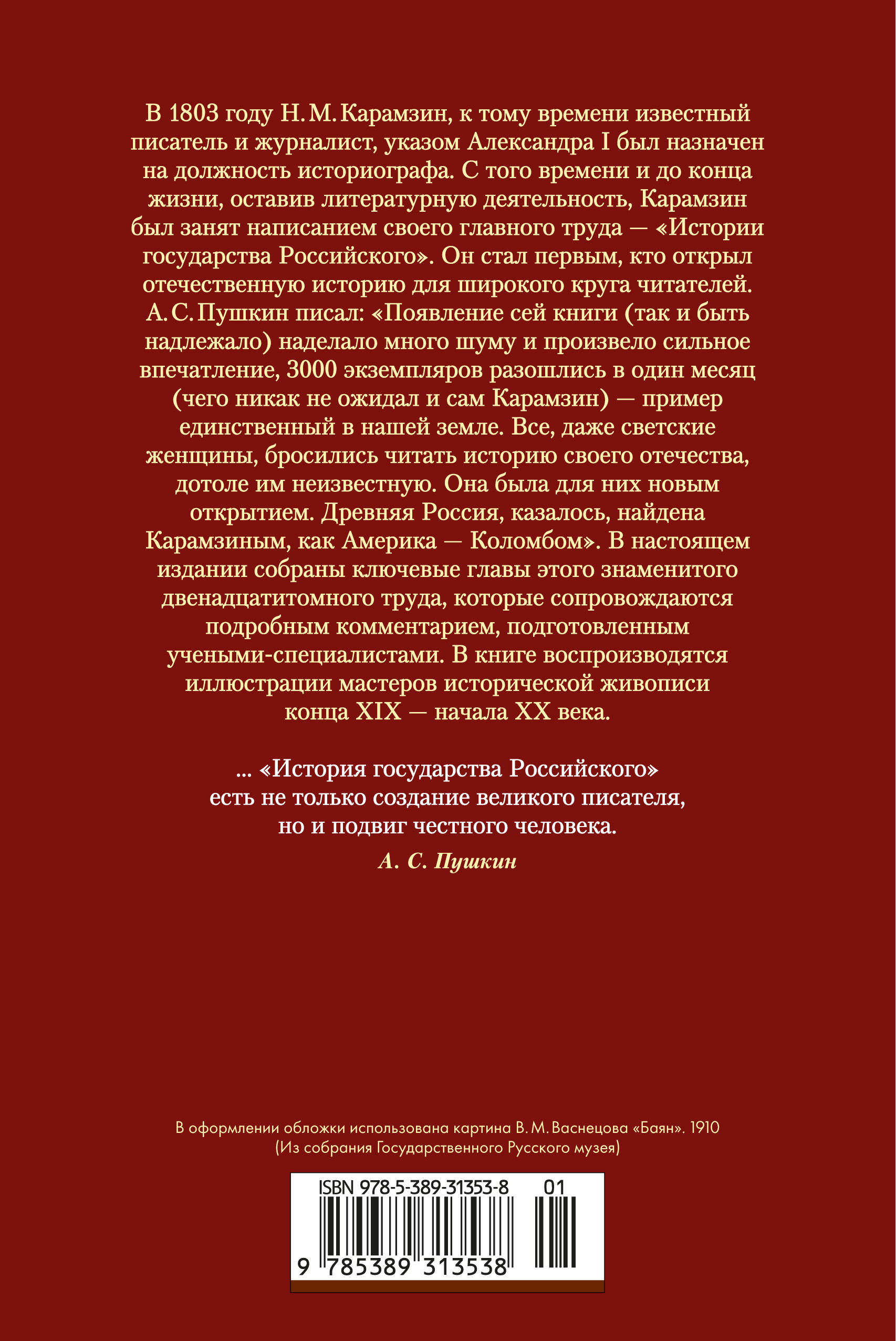 В 1803 году Н. М. Карамзин, к тому времени известный писатель и журналист, указом Александра I был назначен на должность историографа. С того времени и до конца жизни, оставив литературную деятельность, Карамзин был занят написанием своего главного труда — «Истории государства Российского». Он стал первым, кто открыл отечественную историю для широкого круга читателей. А. С. Пушкин писал: «Появление сей книги (так и быть надлежало) наделало много шуму и произвело сильное впечатление, 3000 экземпляров разошлись в один месяц (чего никак не ожидал и сам Карамзин) — пример единственный в нашей земле. Все, даже светские женщины, бросились читать историю своего отечества, дотоле им неизвестную. Она была для них новым открытием. Древняя Россия, казалось, найдена Карамзиным, как Америка — Коломбом». В настоящем издании собраны ключевые главы этого знаменитого двенадцатитомного труда, которые сопровождаются подробным комментарием, подготовленным учеными-специалистами. В книге воспроизводятся иллюстрации мастеров исторической живописи конца XIX — начала XX века.