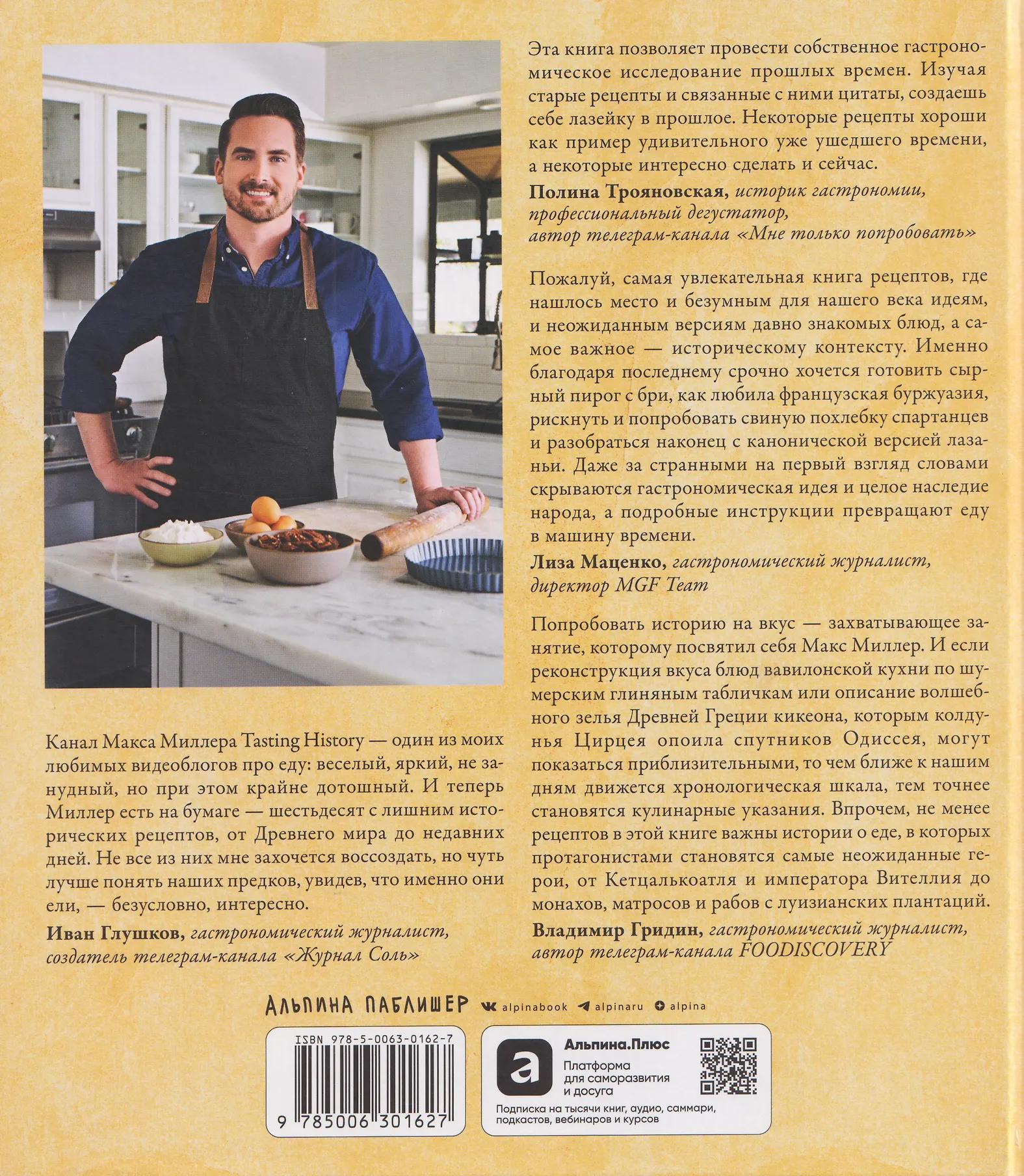 Что ели древние египтяне 4000 лет назад, а чем угощались при дворе империи Мин? Какой вкус был у пирогов в Европе эпохи Ренессанса? Популярный блогер и исследователь Макс Миллер превращает кулинарию в увлекательное путешествие по истории. Его проект Tasting History — сенсация на YouTube, где он готовит блюда по старинным рецептам, адаптируя их для современной кухни, и одновременно рассказывает удивительные истории о культурах прошлого. В книге собрано более шестидесяти рецептов из разных эпох и стран: от тушеного свекольного супа из Вавилона до воздушного тыквенного торта XVI века. Каждый рецепт представлен в двух версиях — оригинальной и современной, с красочными фотографиями и репродукциями. Эта книга станет сокровищем для гурманов и ценителей истории, которые хотят попробовать прошлое на вкус.
