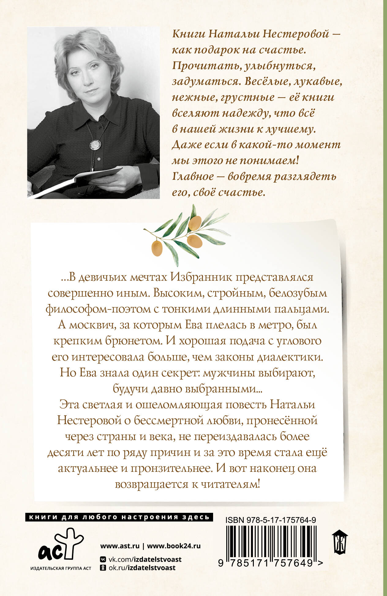 - Книги Натальи Нестеровой — как подарок на счастье. Прочитать, улыбнуться, задуматься. Веселые, лукавые, нежные, грустные — ее книги вселяют надежду, что все в нашей жизни к лучшему. Даже если в какой-то момент мы этого не понимаем! Главное — вовремя разглядеть его, свое счастье.