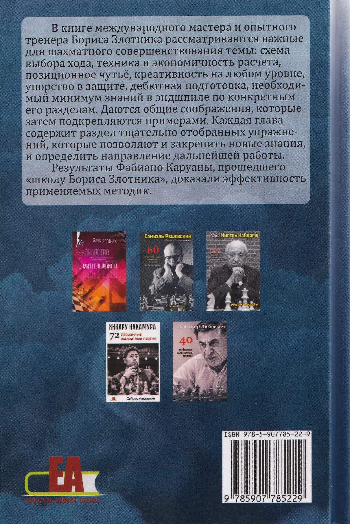 В книге международного мастера и опытного тренера Бориса Злотника рассматриваются важные для шахматного совершенствования темы: схема выбора хода, техника и экономичность расчета, позиционное чутьё, креативность на любом уровне, упорство в защите, дебютная подготовка, необходимый минимум знаний в эндшпиле по конкретным его разделам. Даются общие соображения, которые затем подкрепляются примерами. Каждая глава содержит раздел тщательно отобранных упражнений, которые позволяют и закрепить новые знания, и определить направление дальнейшей работы.