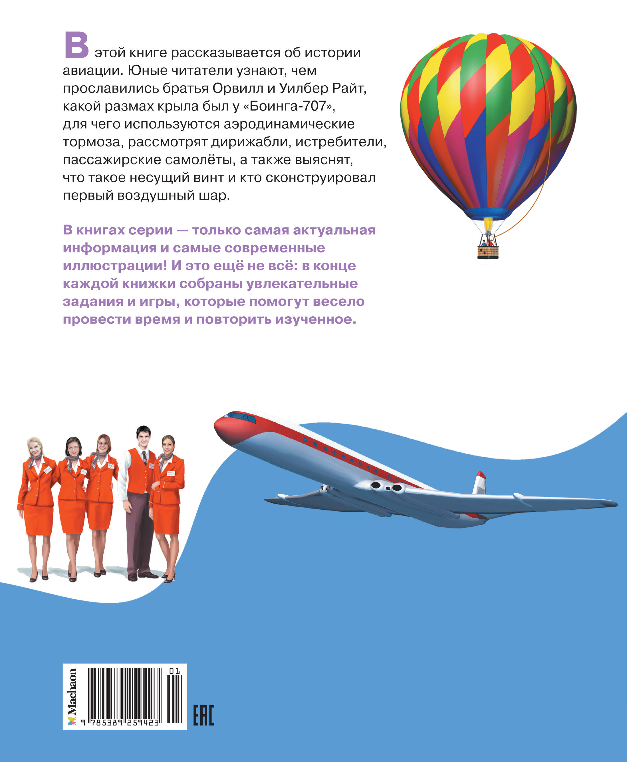 Эта книга поможет мальчикам и девочкам больше узнать об элементах конструкции самолетов, их деталях, познакомиться с великими пилотами. На ярких иллюстрациях представлены названия частей летательного аппарата, а подписи в понятной и доступной форме рассказывают, какая модель самолета изображена, для чего он используется в авиации, как вести себя на борту в случае ЧС и многое другое! В конце энциклопедии мальчики и девочки проверят свои знания, отвечая на вопросы теста и решая увлекательные задания. Серия «Твоя первая энциклопедия» станет прекрасным подарком как для первоклассников, так и для учеников средней школы. В ней собраны книги на самые разные интересные детям темы. Школьники смогут прочитать про эпоху динозавров, изучить анатомию человека, выяснить тайны космоса и многое другое.