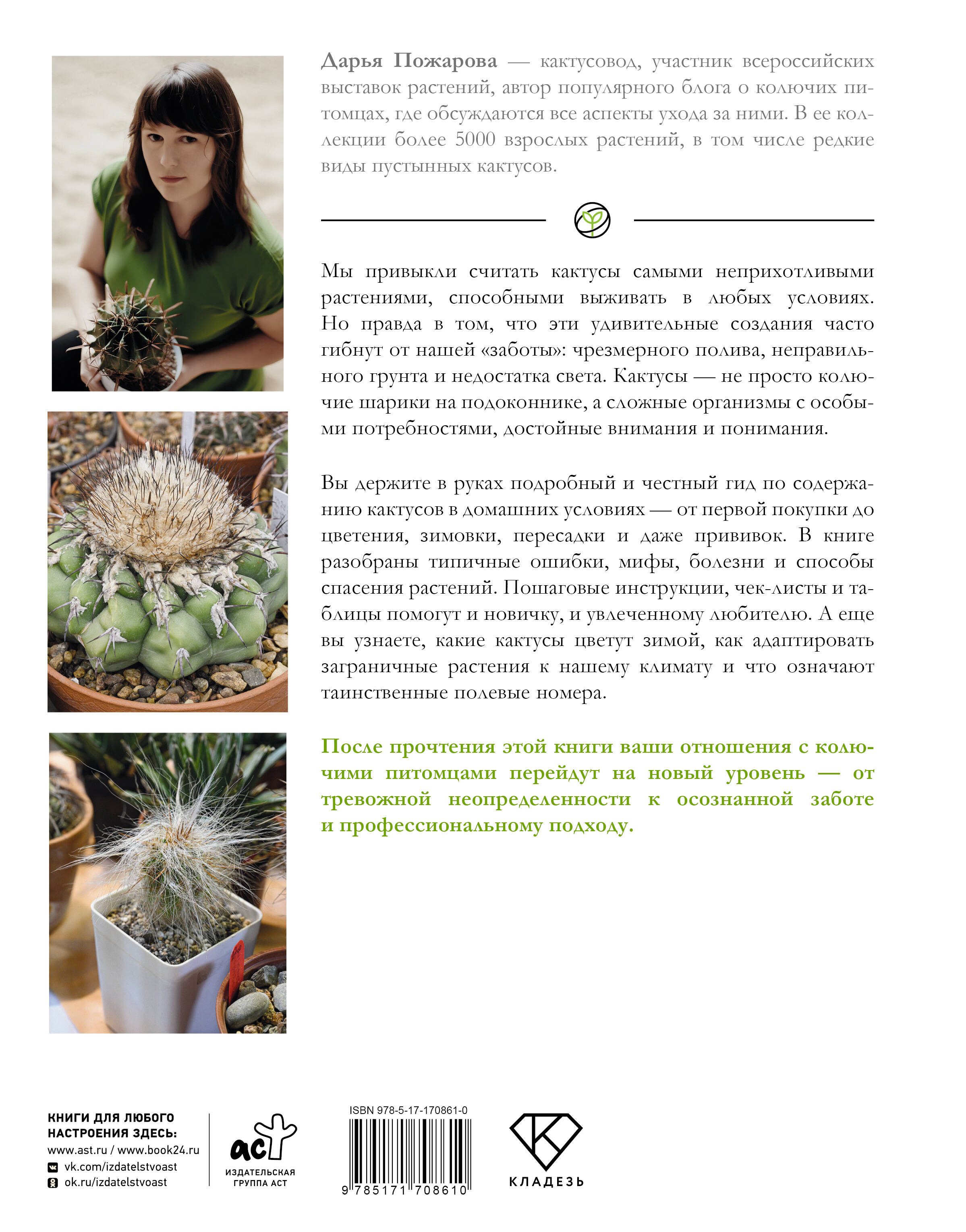 Вы держите в руках подробный и честный гид по содержанию кактусов в домашних условиях — от первой покупки до цветения, зимовки, пересадки и даже прививок. В книге разобраны типичные ошибки, мифы, болезни и способы спасения растений. Пошаговые инструкции, чек-листы и таблицы помогут и новичку, и увлеченному любителю. А еще вы узнаете, какие кактусы цветут зимой, как адаптировать заграничные растения к нашему климату и что означают таинственные полевые номера.