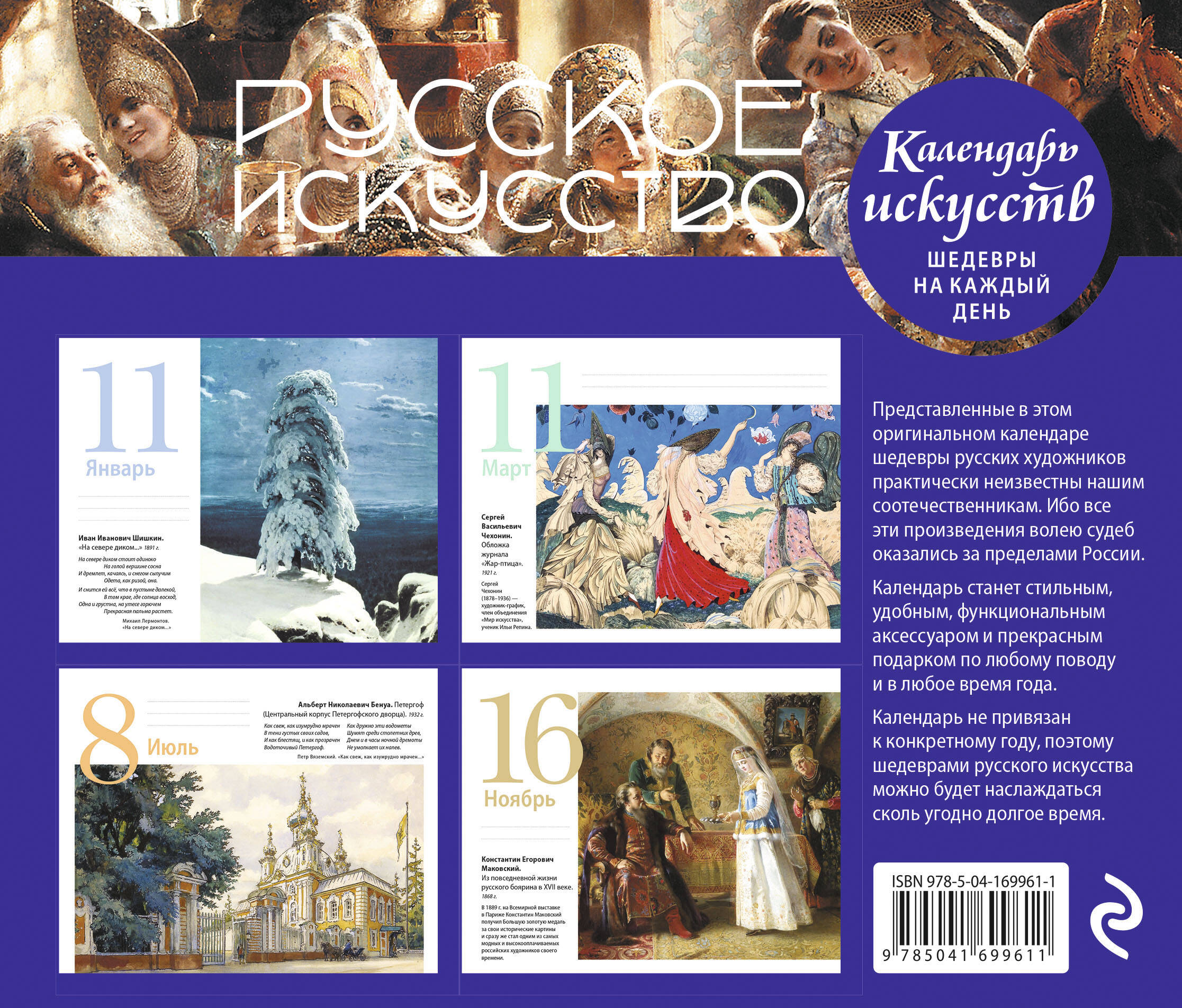 Вечный календарь «Русское искусство» из серии «Шедевры на каждый день» — это креативная инновация во Вселенной искусства. Календарь объединяет в себе достоинства художественного альбома, картинной галереи и путеводителя по изобразительному искусству. Благодаря ему мы впервые имеем уникальную возможность насладиться шедеврами русского искусства, причем теми его образцами, которые до сих пор остаются практически неизвестны отечественному ценителю.