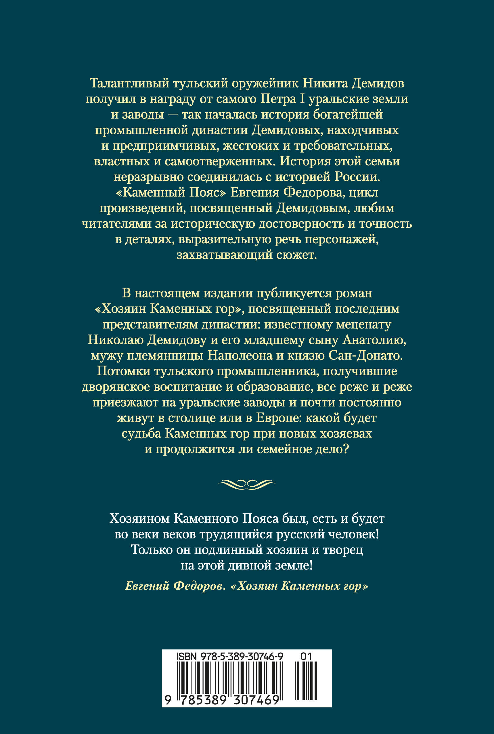 Талантливый тульский оружейник Никита Демидов получил в награду от самого Петра I уральские земли и заводы — так началась история богатейшей промышленной династии Демидовых, находчивых и предприимчивых, жестоких и требовательных, властных и самоотверженных. История этой семьи неразрывно соединилась с историей России. Произведения Евгения Федорова, посвященные Демидовым, любимы читателями за историческую достоверность и точность в деталях, выразительную речь персонажей, захватывающий сюжет. В настоящем издании публикуется роман «Хозяин каменных гор», посвященный истории семьи Демидовых конце XVIII – середине XIX века и последним представителям династии: известному меценату Николаю Демидову и его младшему сыну Анатолию, мужу племянницы Наполеона и князю Сан-Донато. Потомки тульского промышленника, получившие дворянское воспитание и образование, все реже и реже приезжают на уральские заводы и почти постоянно живут в столице или в Европе: какой будет судьба Каменных гор при новых хозяевах и продолжится ли семейное дело?
