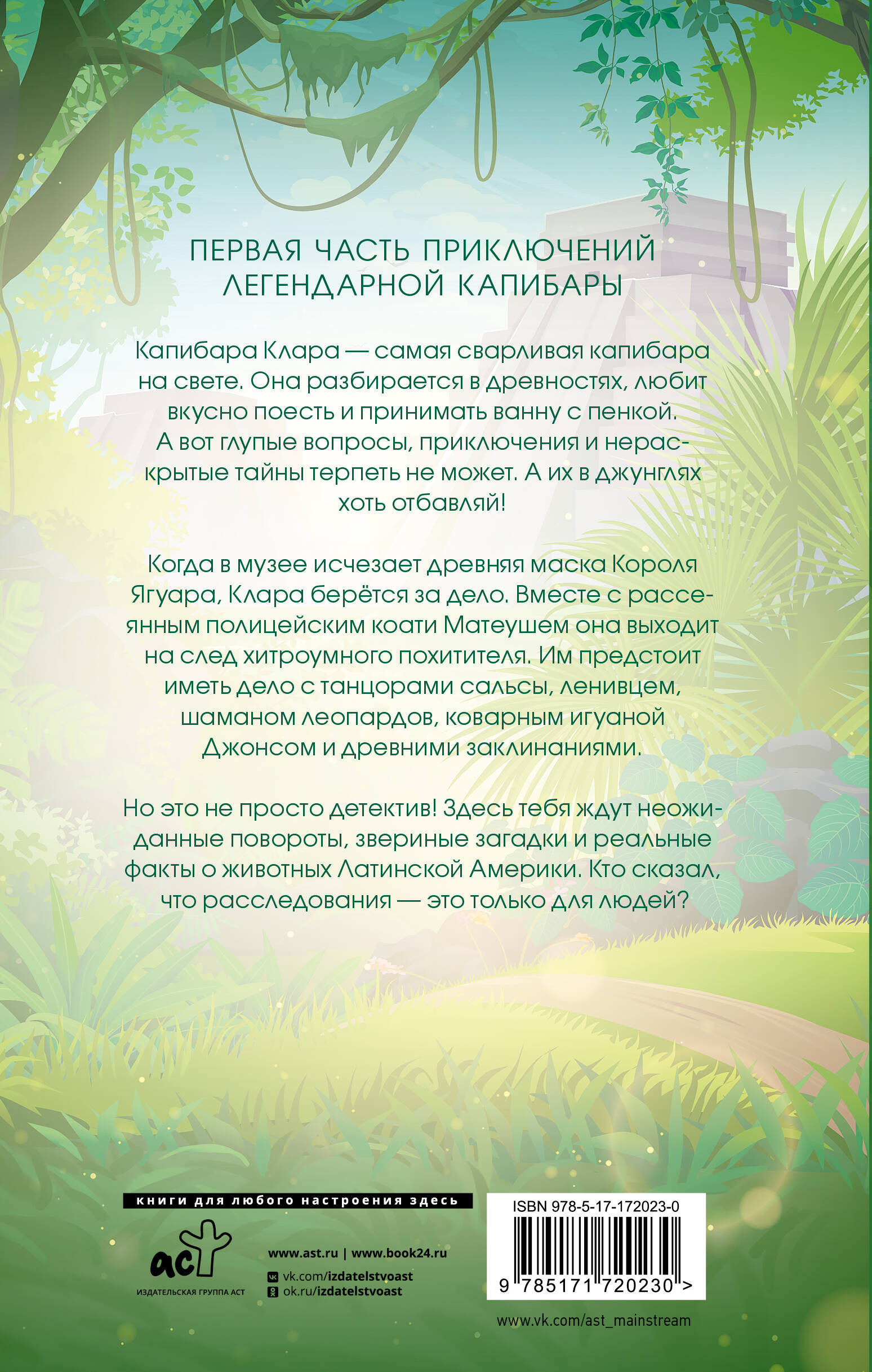 Капибара Клара — самая сварливая капибара на свете. Она разбирается в древностях, любит вкусно поесть и принимать ванну с пенкой. А вот глупые вопросы, приключения и нераскрытые тайны терпеть не может. А их в джунглях хоть отбавляй!