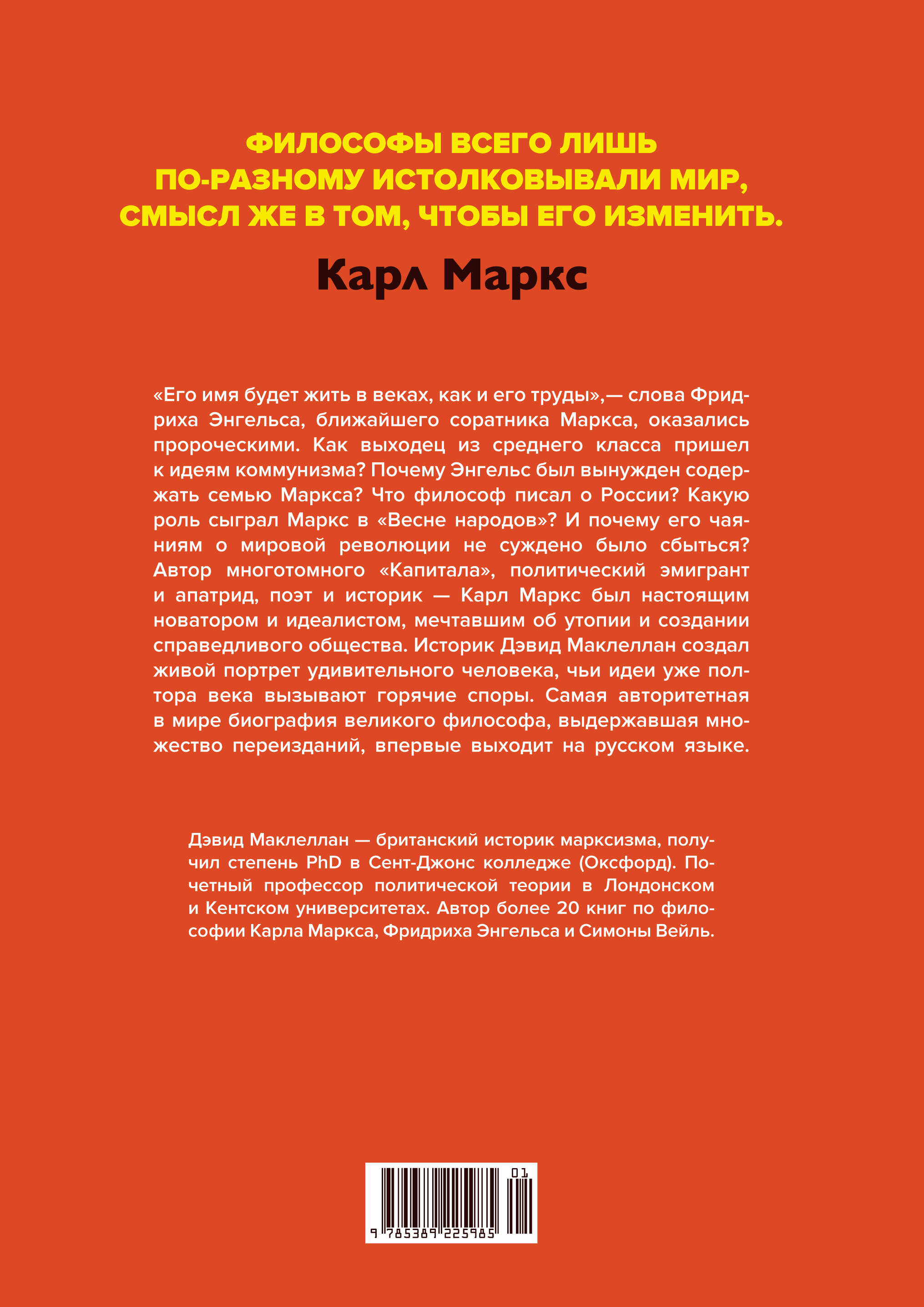 Имя Карла Маркса с детства знакомо каждому человеку в нашей стране. Его идеи легли в основу Советского государства — марксизм-ленинизм стал официальной идеологией страны. Однако сам Карл Маркс был скромным человеком и не жаждал популярности. "Манифест коммунистической партии" и "Капитал" навсегда изменили историю политической мысли, при этом философ вместе с семьей много лет провел в нищете и умер в безвестности. Ведущий исследователь жизни и идей Маркса, профессор Дэвид Маклеллан создал наиболее полную биографию, которая знакомит нас с трагической судьбой этого великого человека — мыслителя, изгнанника, любящего мужа и верного друга. Его многогранная философия рассказана в этом международном бестселлере столь увлекательно, что не остается сомнений: Карл Маркс по праву считается человеком, изменившим мир.