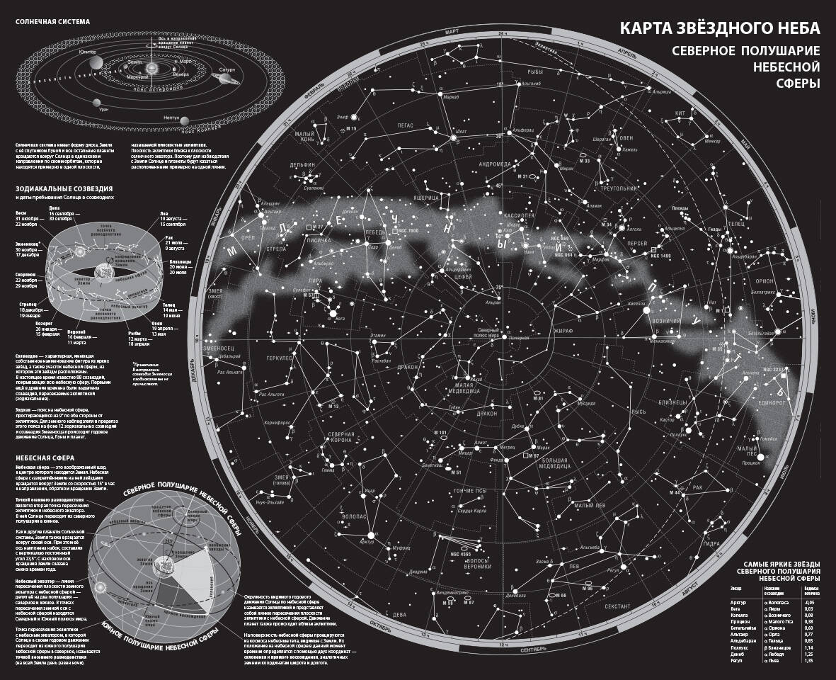 Звёзды на карте ранжированы по видимой звёздной величине. Даны названия самых ярких звёзд и условные очертания всех 88 созвездий. Приведёны краткие сведения о Солнечной системе, небесной сфере, звёздных координатах, эклиптике и зодиакальном круге. Размеры карты в сложенном виде 112,86х213,33 мм. Карта будет полезна для всех, кто интересуется астрономией.