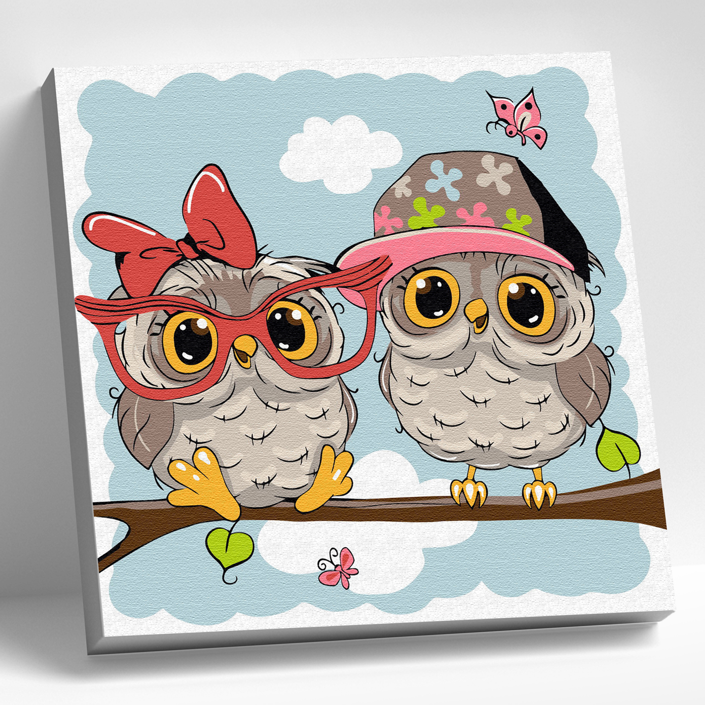 С помощью набора для творчества можно нарисовать двух маленьких совят, сидящих на ветке. На одной надета пестрая кепка, на другой - крупная оправа от очков. Для такого творчества не требуются специальные художественные навыки. Нужно лишь следовать инструкции и время от времени сверяться с цветовой схемой рисунка.