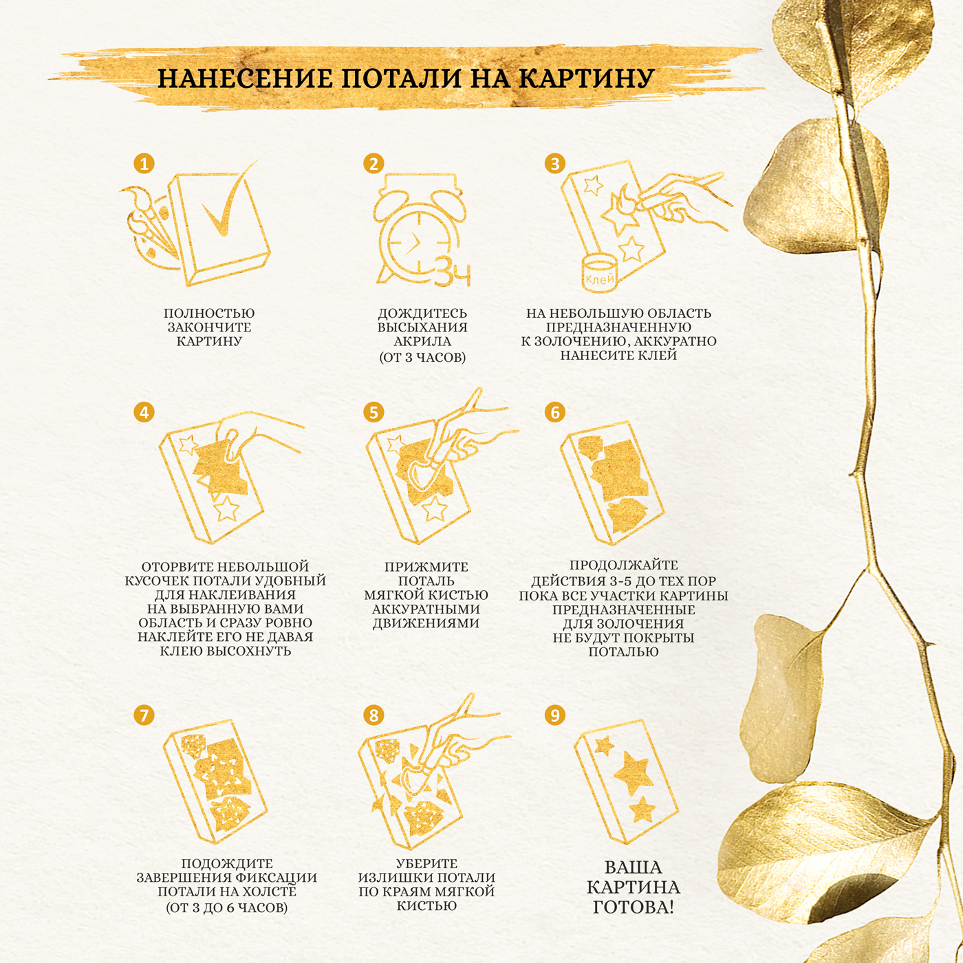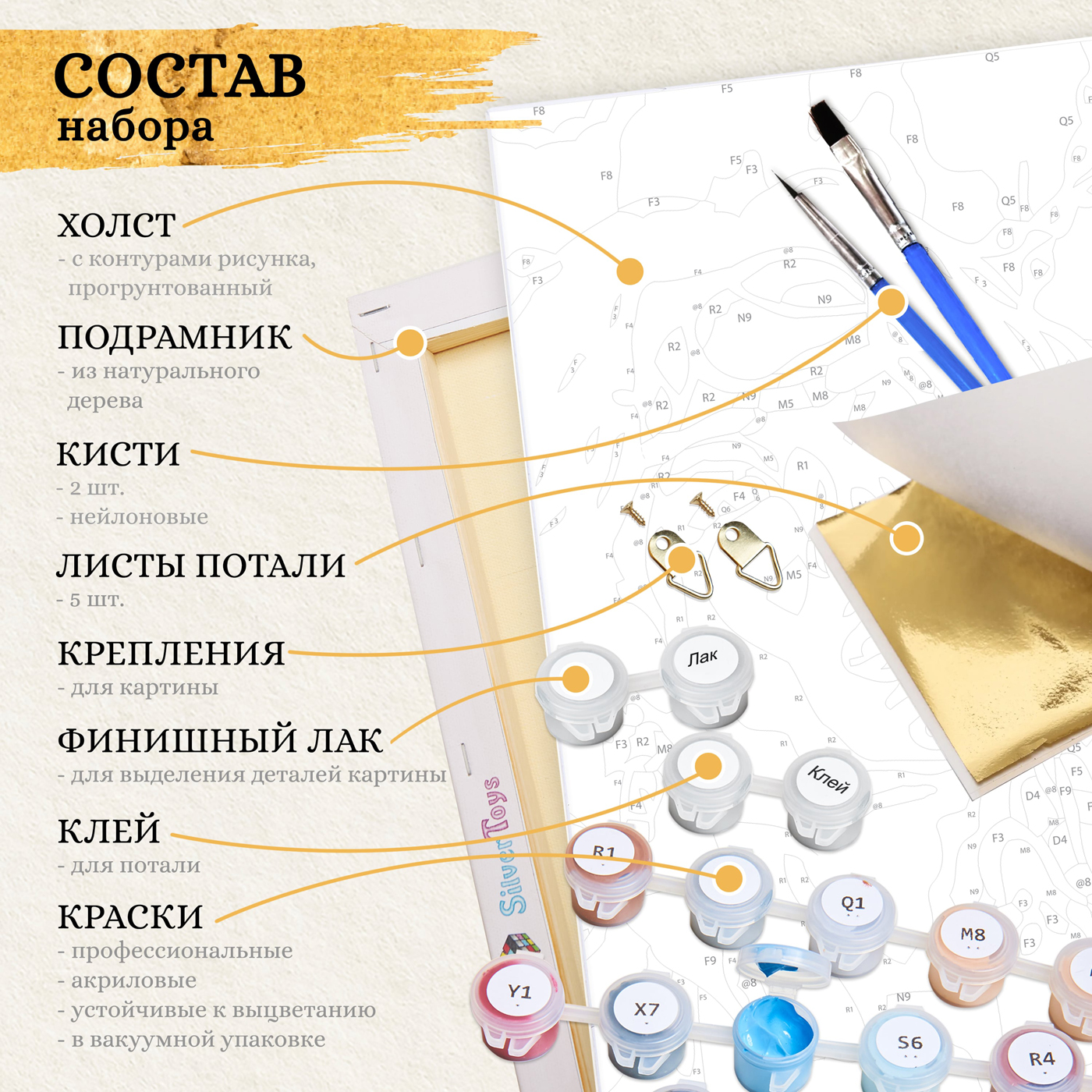 Состав набора: холст с нанесенной схемой рисунка на подрамнике, качественные нейлоновые кисти разного размера, 3 шт., профессиональные акриловые краски, устойчивые к выцветанию, фурнитура для крепления картины к стене, специальный финишный лак, клей для потали, листы потали.