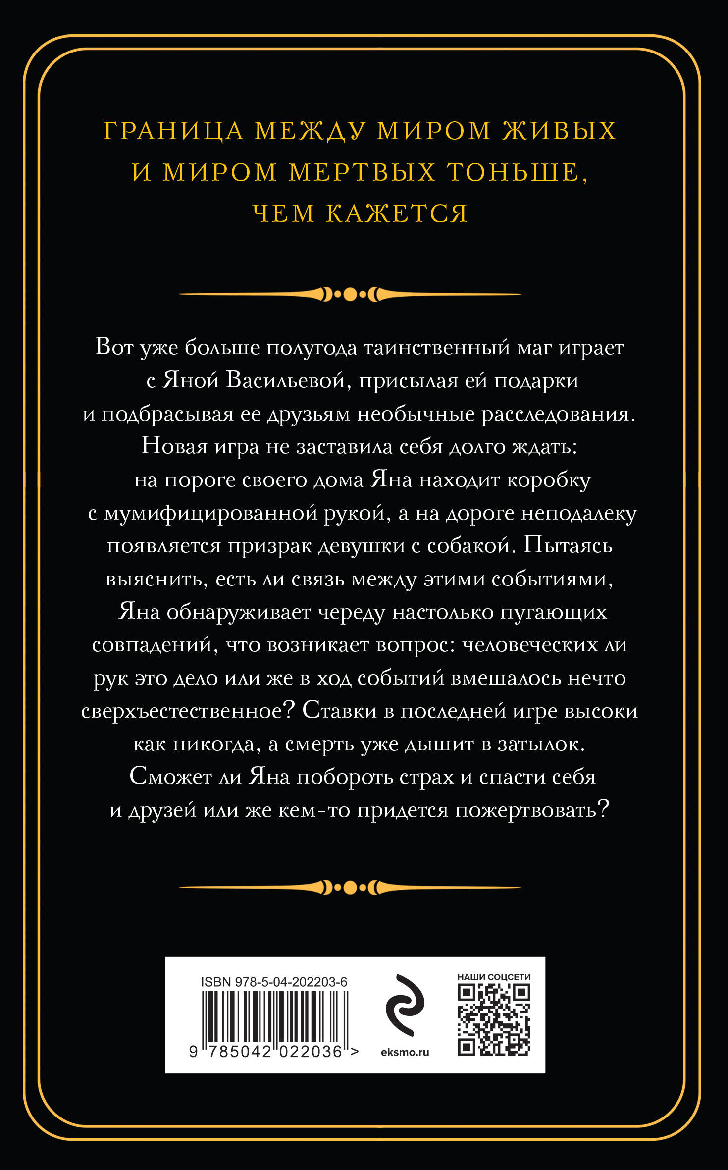Вот уже больше полугода таинственный маг играет с Яной Васильевой, присылая ей подарки и подбрасывая ее друзьям необычные расследования. Новая игра не заставила себя долго ждать: на пороге своего дома Яна находит коробку с мумифицированной рукой, а на дороге неподалеку появляется призрак девушки с собакой. Пытаясь выяснить, если ли связь между этими событиями, Яна обнаруживает череду настолько пугающих совпадений, что возникает вопрос: человеческих ли рук это дело или же в ход событий вмешалось нечто сверхъестественное? Ставки в последней игре высоки как никогда, а смерть уже дышит в затылок. Сможет ли Яна побороть страх и спасти себя и друзей или же кем-то придется пожертвовать?