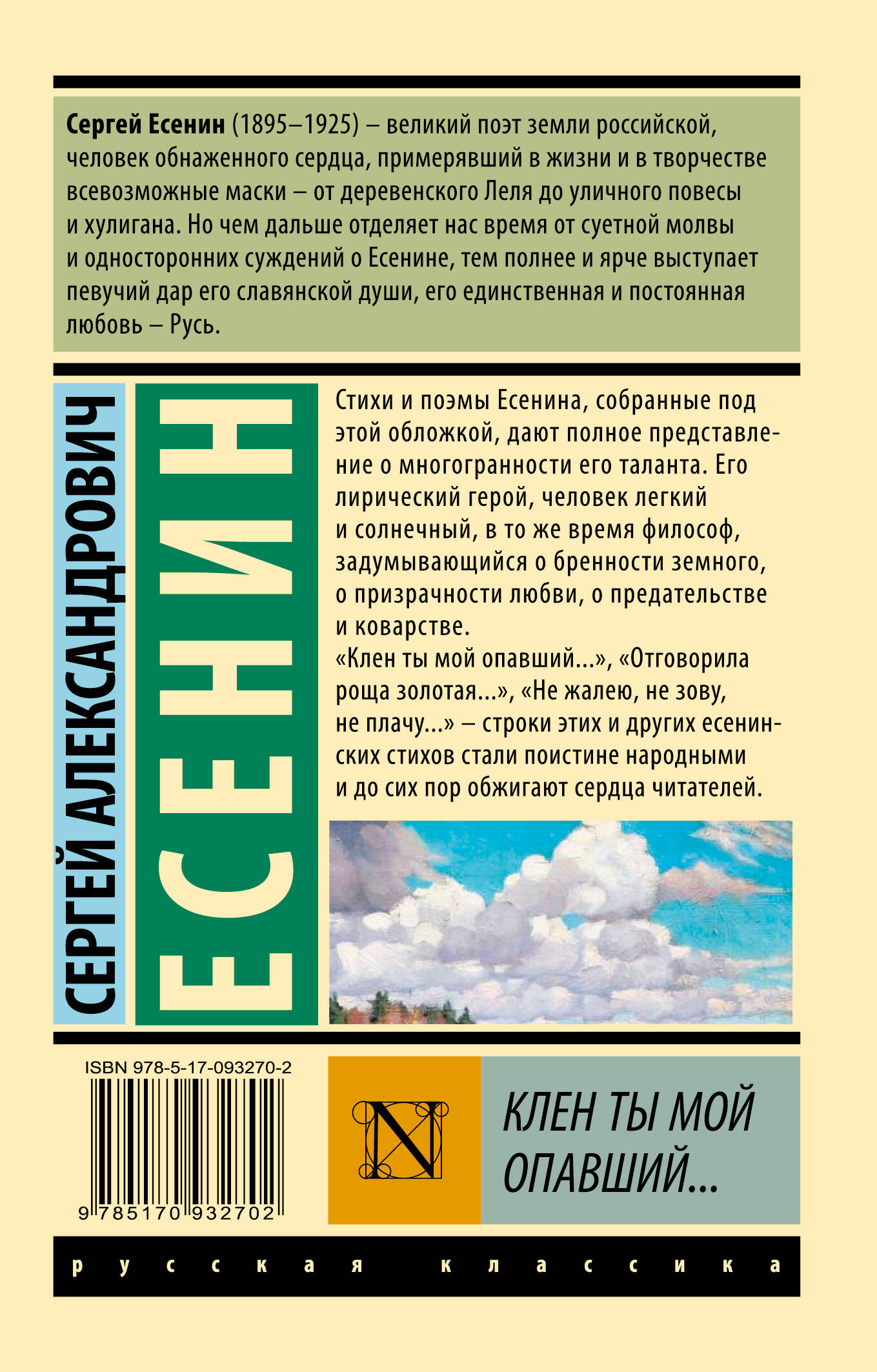 Стихи и поэмы Есенина, собранные под этой обложкой, дают полное представление о многогранности его таланта. Его лирический герой, человек легкий и солнечный, в то же время философ, задумывающийся о бренности земного, о призрачности любви, о предательстве и коварстве.