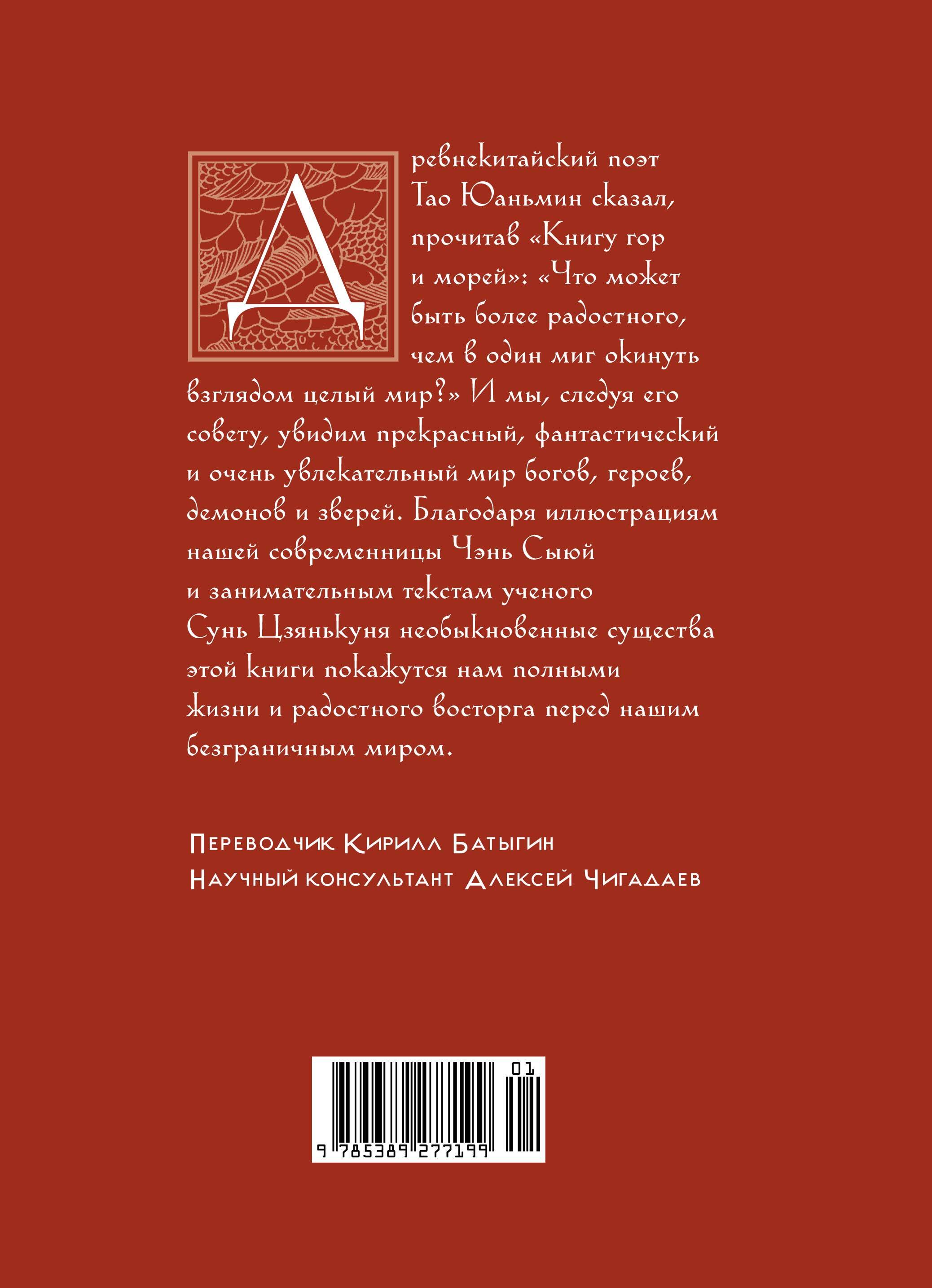 "Книга гор и морей" — своеобразный атлас континентального Китая. Полный альманах очень обширен, но для этого издания составители отобрали из древнего канона самых занимательных и показательных богов, героев, демонов и зверей. Каждое из фантастических существ оживает благодаря бесподобным иллюстрациям художницы Чэнь Сыюй и доступным пояснениям великого с юных лет интерпретатора "Книги" Сунь Цзянькуня.
