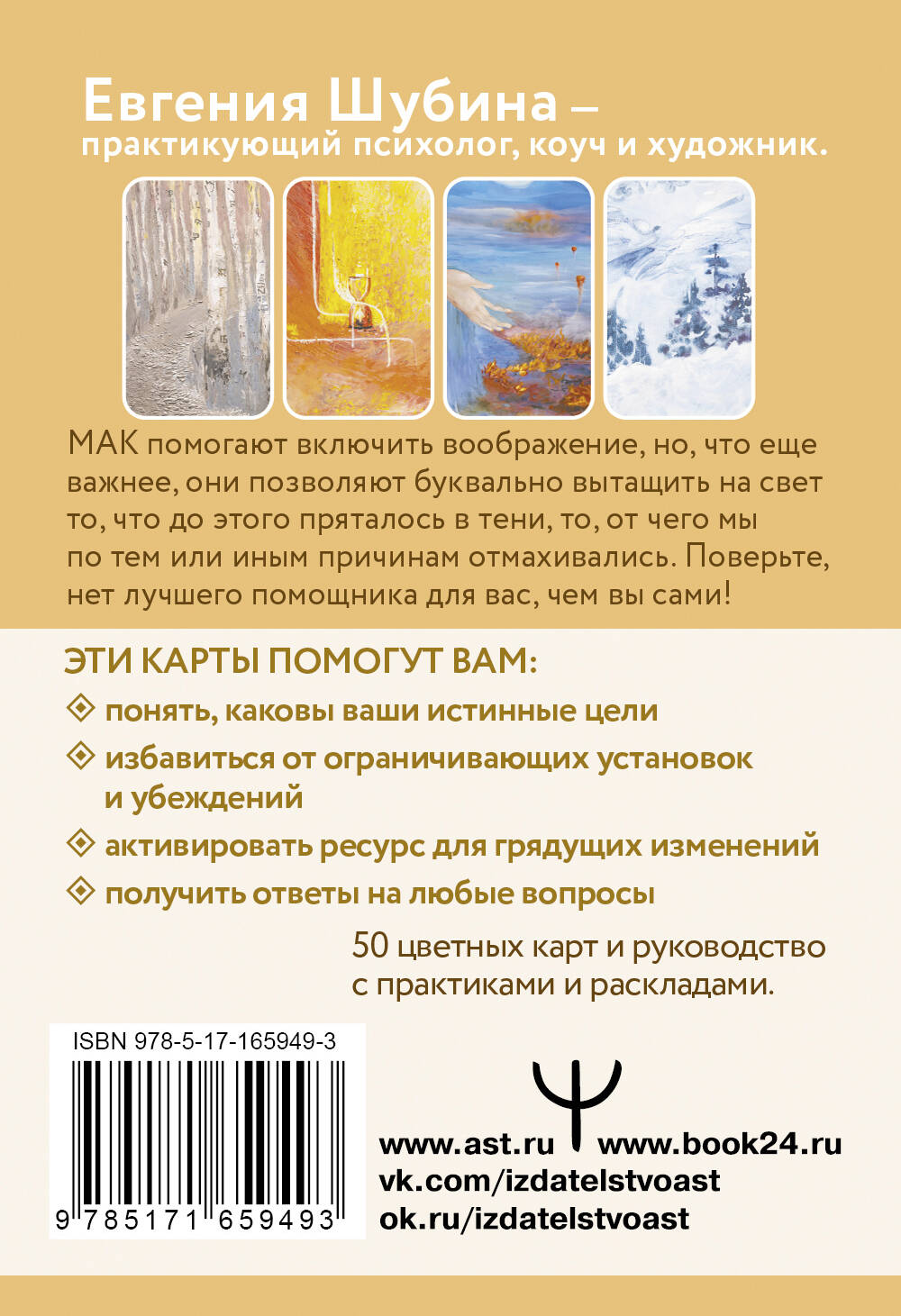 Универсального рецепта счастливой и успешной жизни нет, однако можно понять, какой путь следует выбрать именно вам. Эта колода карт — проводник к глубинам вашего подсознания. Работая с картами, вы сможете понять, каковы ваши истинные цели и что важно и ценно именно для вас. Вы научитесь отличать ваши стремления от чужих, навязанных окружающими, и найдете способы и ресурсы для их достижения. С помощью метафорических образов вы также сможете проработать старые травмы и негативные установки, которые мешают вам достигать желаемого. Вы избавитесь от всего, что не дает вам развиваться, а самое главное, обретете вдохновение и ресурс для положительных изменений.