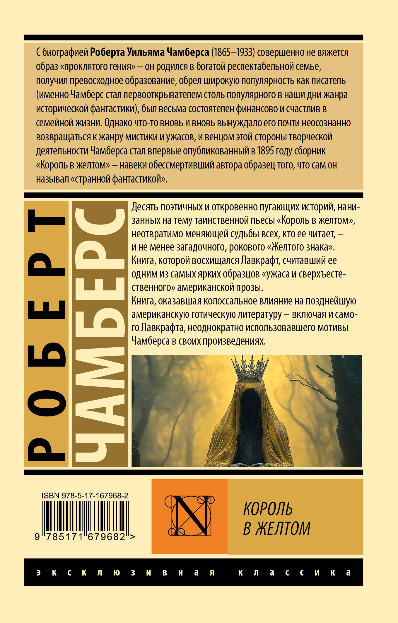 — «Король в желтом» — культовая книга жанра хоррор, один из самых ярких образцов «ужаса и сверхъестественного» американской прозы. Творчество Роберта Чамберса вдохновило огромное количество последующих авторов, начиная от Говарда Филлипса Лавкрафта и Стивена Кинга и заканчивая создателем телесериала «Настоящий детектив» Ником Пиццолатто.