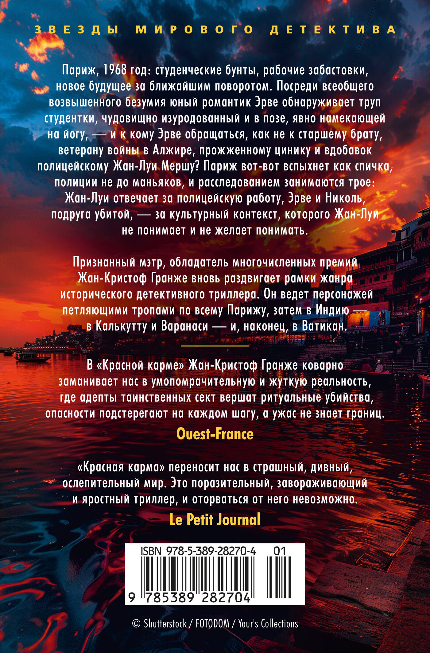 В «Красной карме» будут зловещие секты, человеческая жестокость, родовые тайны и хрупкая надежда. Гранже ведет своих персонажей петляющими тропами по всему Парижу, затем в Индию — в Калькутту и Варанаси, где им откроется страшная, обагренная кровью истина, — и, наконец, в Ватикан, где обнаружится разгадка и, возможно, возродится надежда. Эрве, Жан-Луи и Николь могли стать героями Парижа 1968-го — но нет, они стали героями совсем другой истории, гораздо жутче и кровавее.