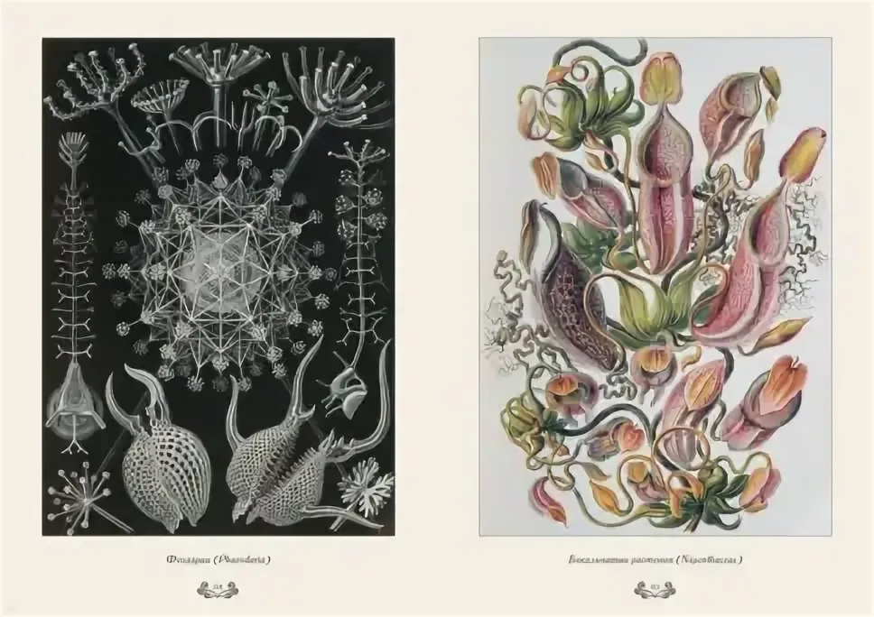 Профессора естествознания Эрнста Геккеля (1834—1919) при жизни называли «немецким Дарвином». И хотя многие идеи ученого позднее были опровергнуты, ряд введенных им терминов – "экология", "филогенез", "онтогенез" и др. – навсегда вошли в научный лексикон. Более значительным оказался след Геккеля в истории искусства благодаря его книге «Красота форм в природе» ("Kunstformen der Natur"), издававшейся по частям с 1899 по 1904 годы. Этот труд содержал первое систематическое описание организмов, исследованных профессором с помощью микроскопа, а также 100 литографических таблиц, исполненных Адольфом Гильчем по эскизам и рисункам самого Геккеля. Многие дизайнеры и архитекторы эпохи модерн воплотили в своих произведениях образы со страниц этой книги, подтвердив тем самым слова Геккеля, сказанные им в предисловии к одному из изданий: «В этих природных формах вы найдете множество новых и уникальных мотивов».