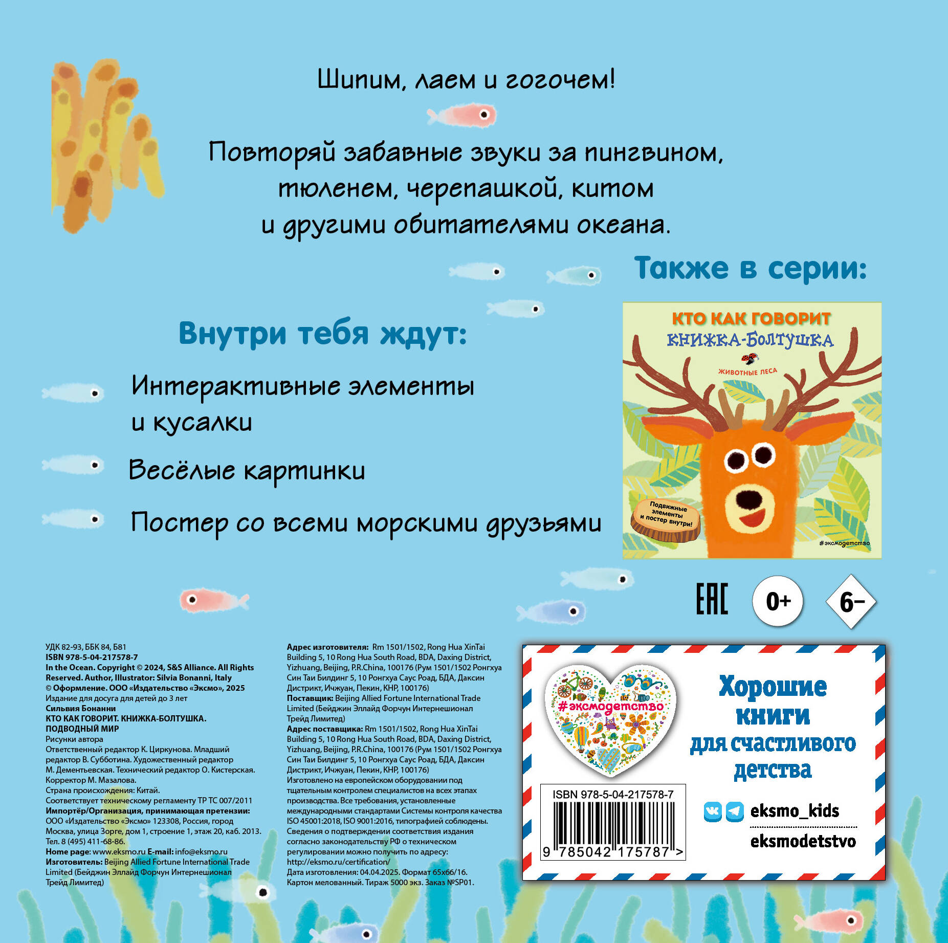 Хочешь узнать, как разговаривают жители подводного мира? Тогда открывай книгу и повторяй забавные звуки за пингвином, тюленем, черепашкой, китом и другими обитателями океана. А ещё узнай много интересного про животных: где они обитают, что любят делать и чем питаются.