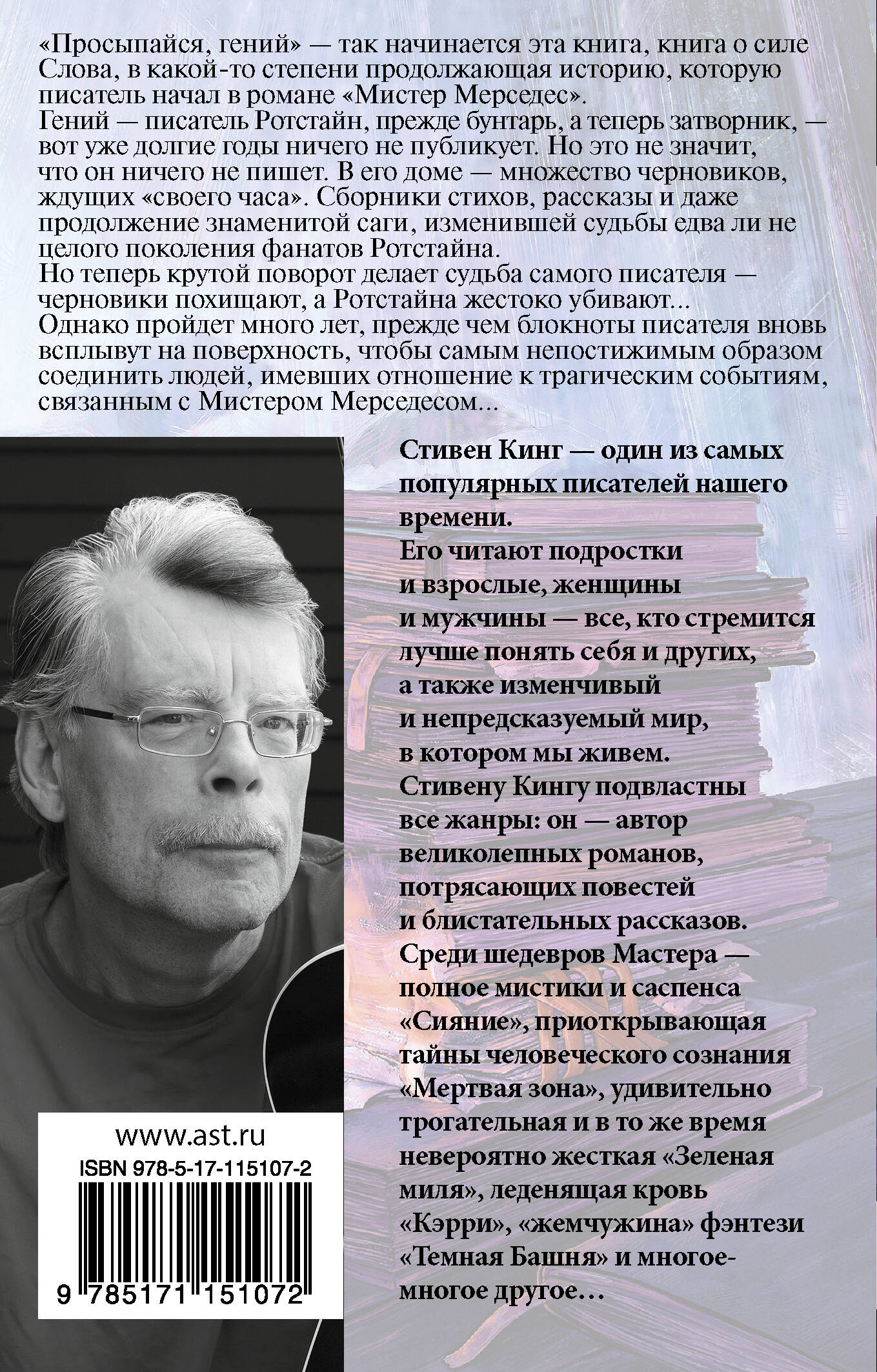 "Просыпайся, гений" — с этих слов начинается новый потрясающий роман Стивена Кинга. Книга о силе Слова, в какой-то степени продолжающая историю, которую писатель начал в романе "Мистер Мерседес", и в то же время перекликающаяся с одним из лучших его произведений – "Мизери".