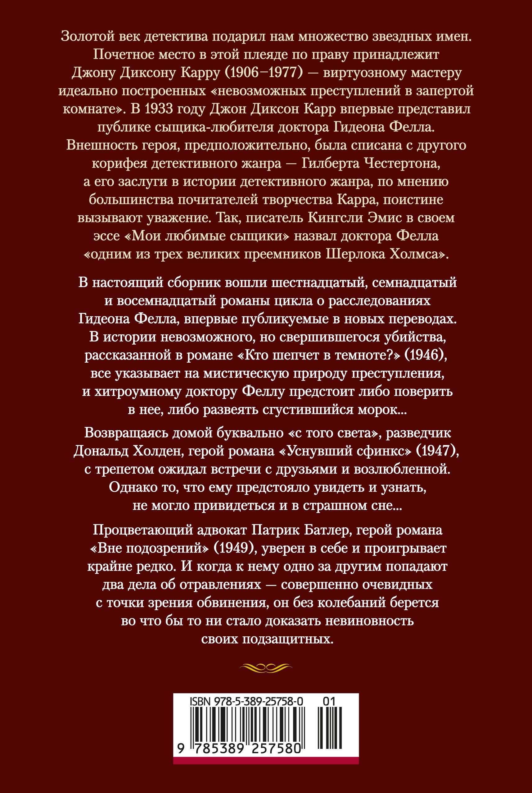 В настоящий сборник вошли шестнадцатый, семнадцатый и восемнадцатый романы цикла о расследованиях Гидеона Фелла, впервые публикуемые в новых переводах.